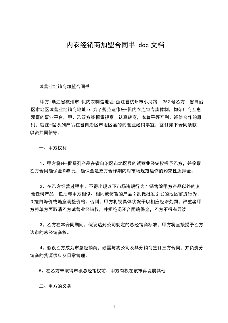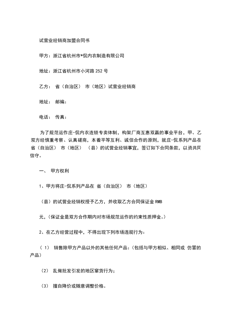 为了规范运作庄-侃内衣连锁专卖体制,构架厂商互惠双赢的事业平台,甲、乙双方经慎重考察、认真磋商,本着平等互利、诚信合作的原则,就庄-侃系列产品在 省(自治区) 市(地区) (县)的试营业经销事宜,签订如下合同条款,以资共同信守。