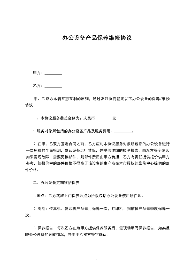 甲、乙双方本着互惠互利的原则,通过友好协商签定以下办公设备的保养/维修协议:
