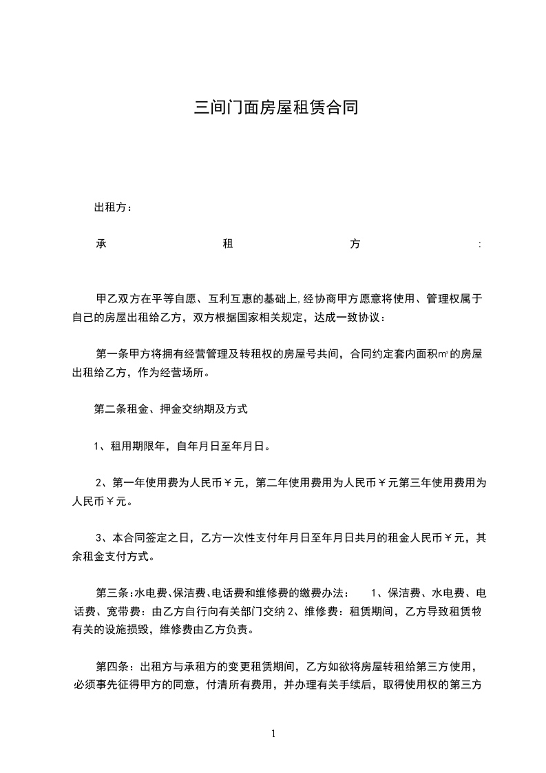 三、租金该房屋租金年租金为_____元整。租赁期间,甲方不得以任何理由任意调整租金。