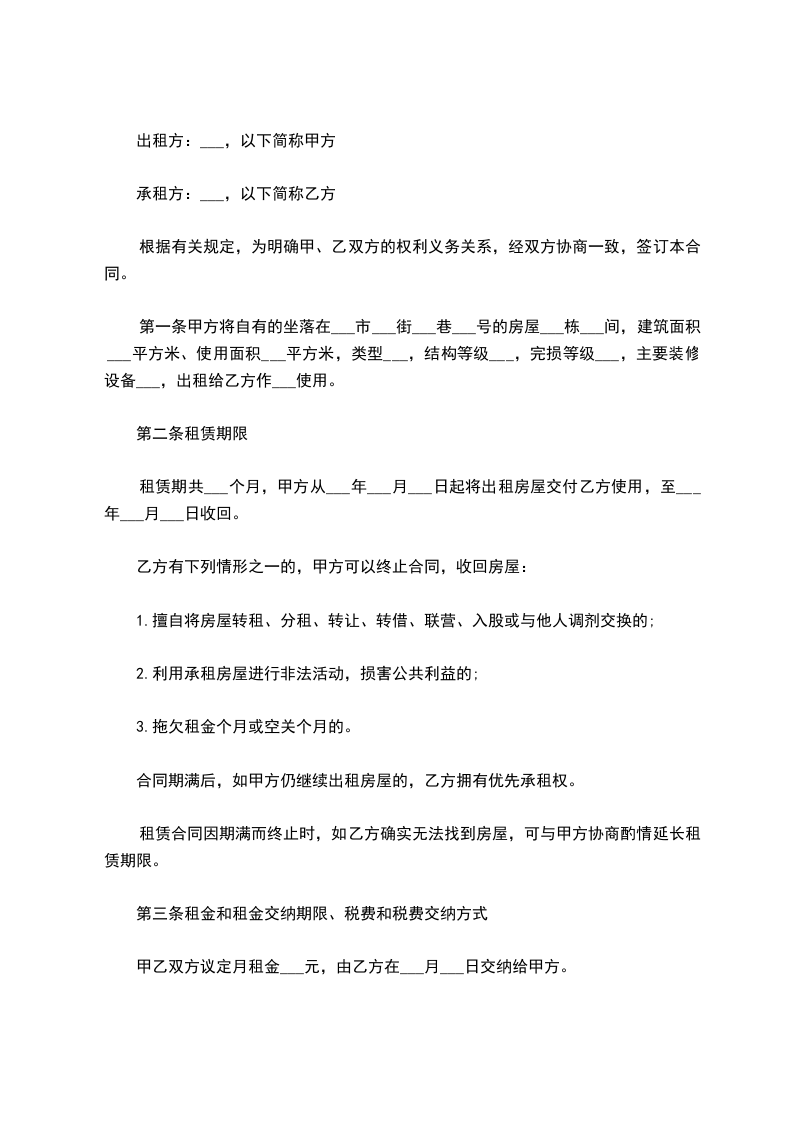 二、房屋租赁期限房屋租赁期限自________年____月____日至________年____月____日止。