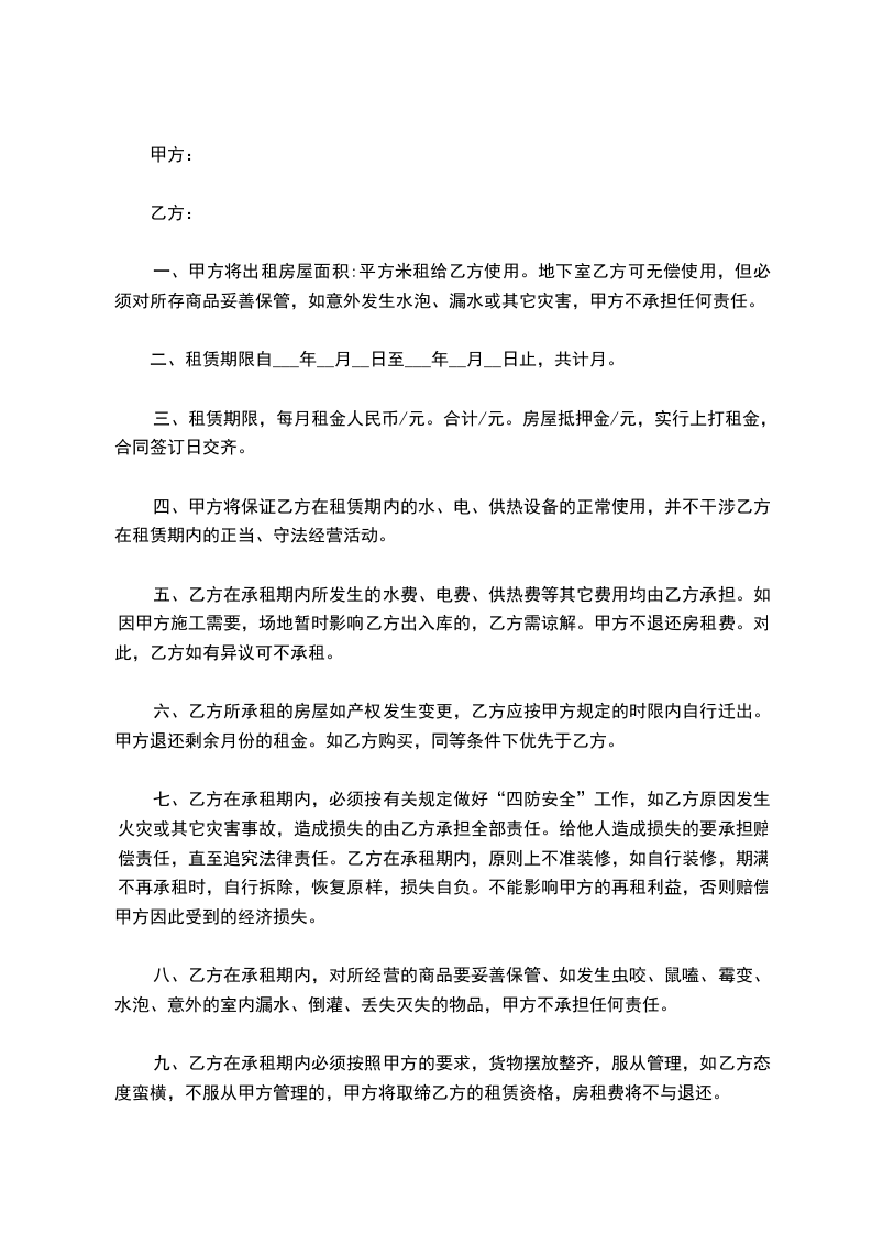 一、甲方将出租房屋面积:平方米租给乙方使用。地下室乙方可无偿使用,但必须对所存商品妥善保管,如意外发生水泡、漏水或其它灾害,甲方不承担任何责任。