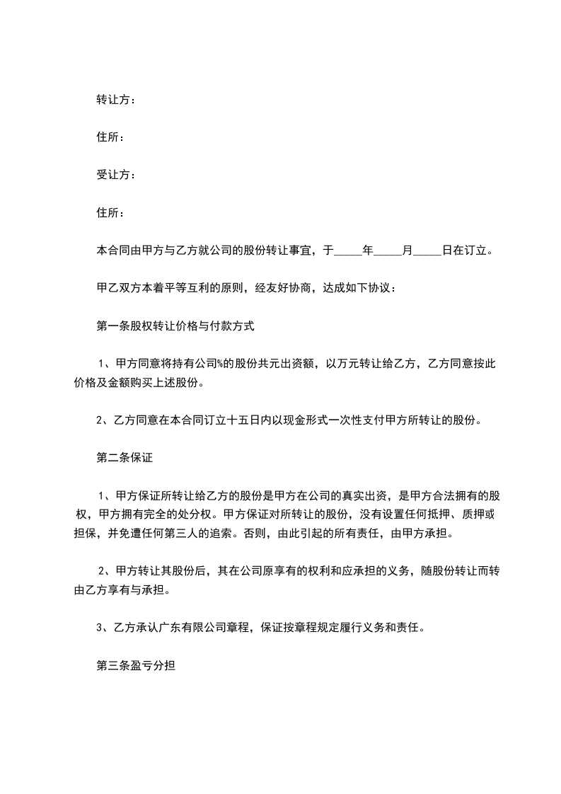 1、甲方同意将持有公司%的股份共元出资额,以万元转让给乙方,乙方同意按此价格及金额购买上述股份。