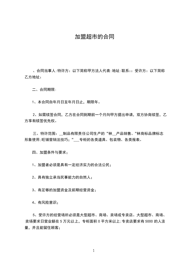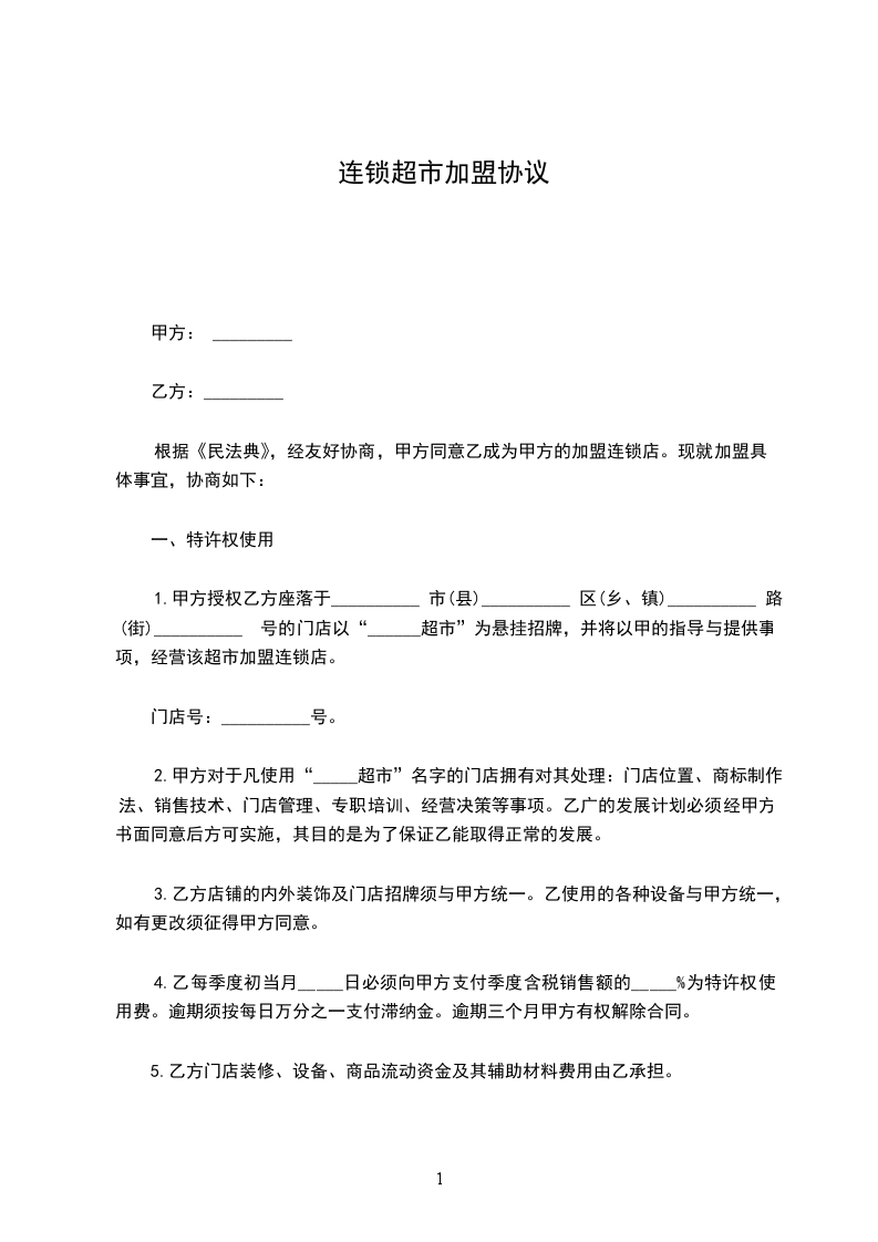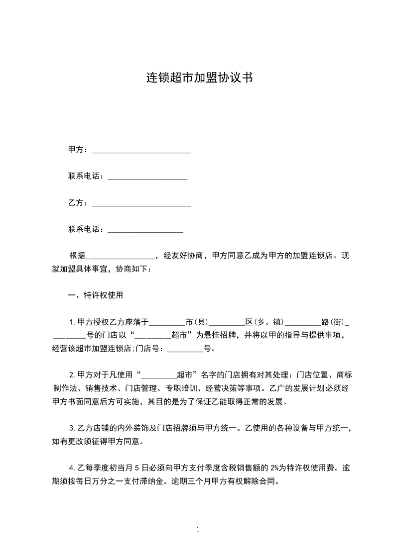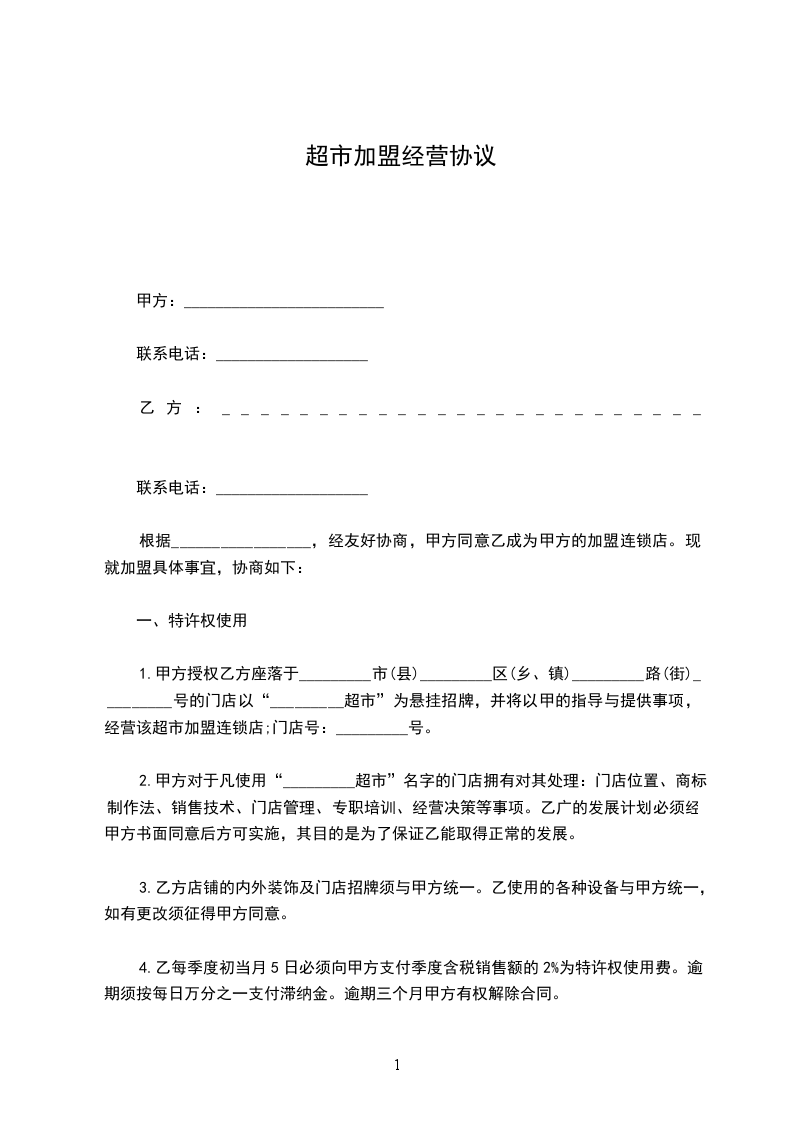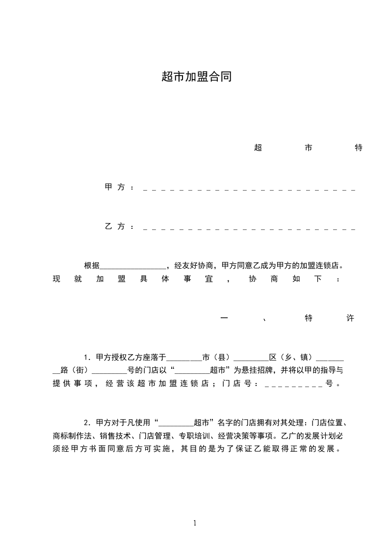 1.甲方授权乙方座落于_________市(县)_________区(乡、镇)_________路(街)_________号的门店以“_________超市”为悬挂招牌,并将以甲的指导与提供事项,经营该超市加盟连锁店;门店号:_________号。