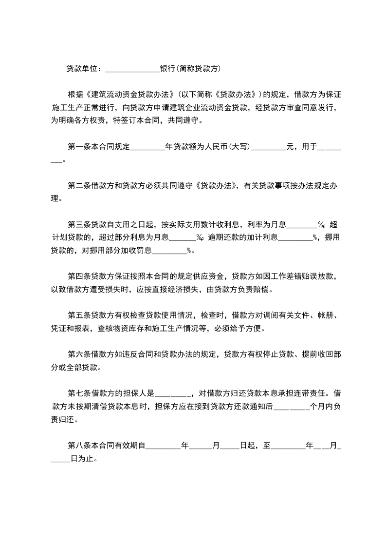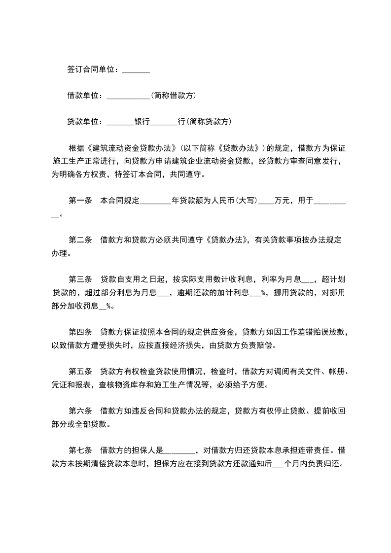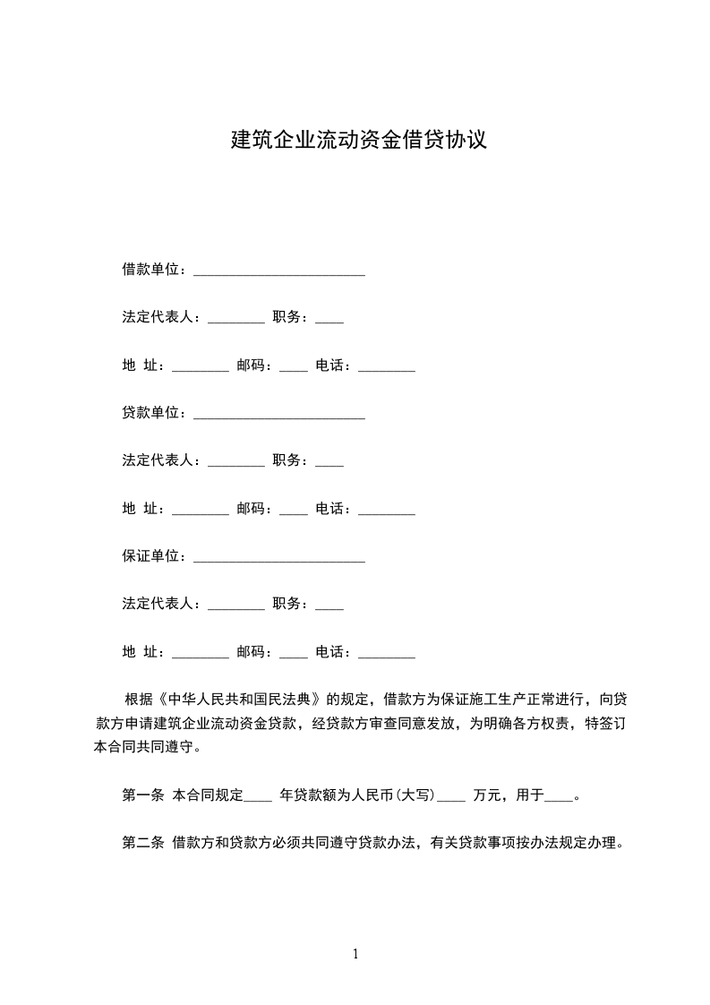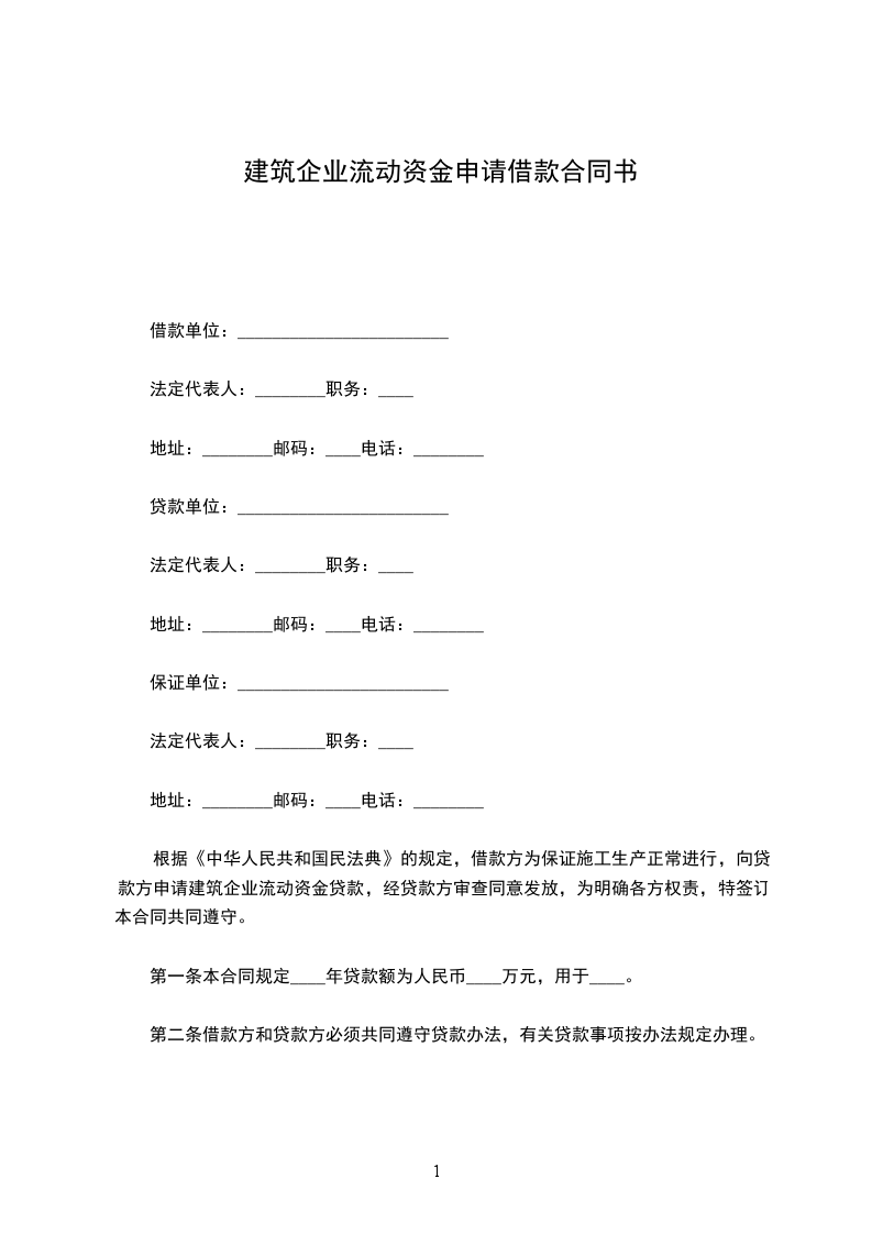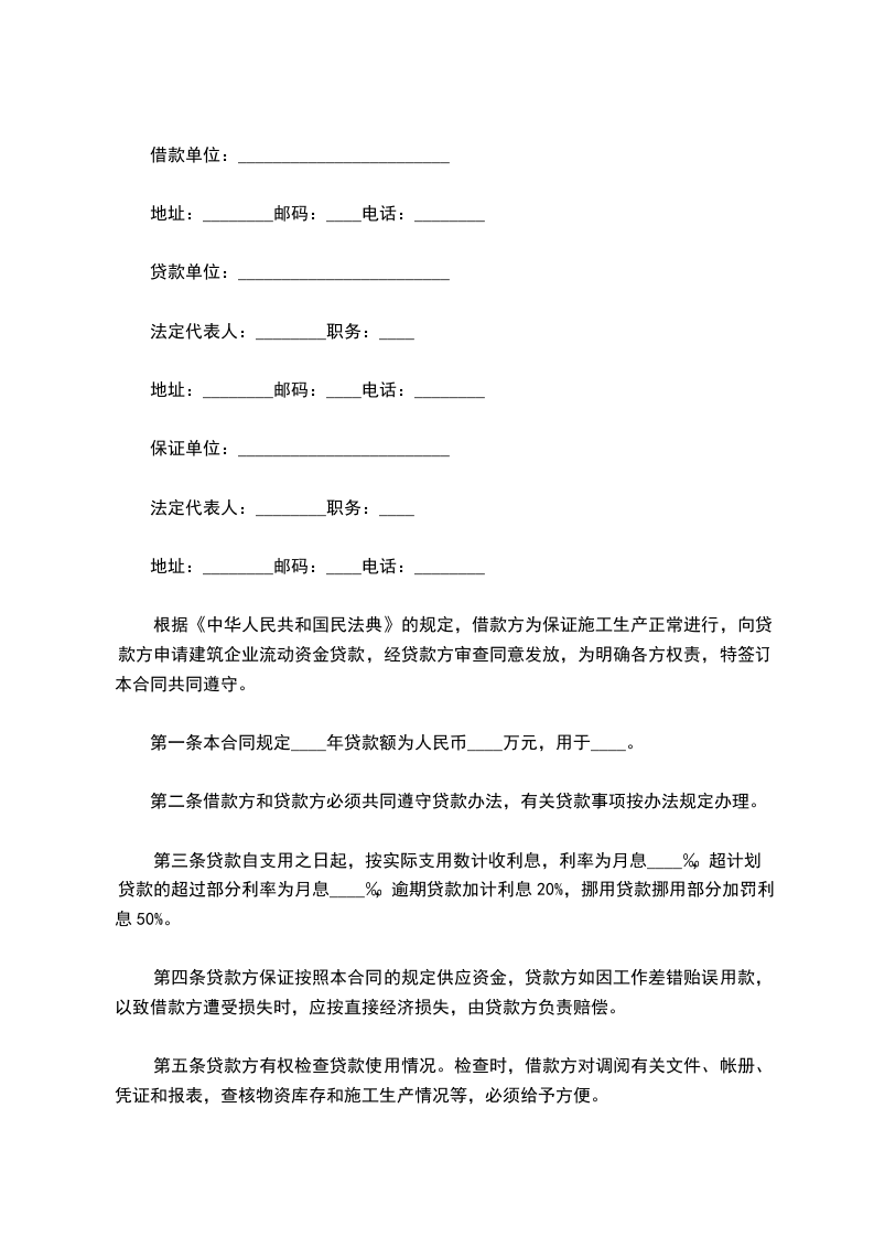 根据《中华人民共和国民法典》的规定,借款方为保证施工生产正常进行,向贷款方申请建筑企业流动资金贷款,经贷款方审查同意发放,为明确各方权责,特签订本合同共同遵守。