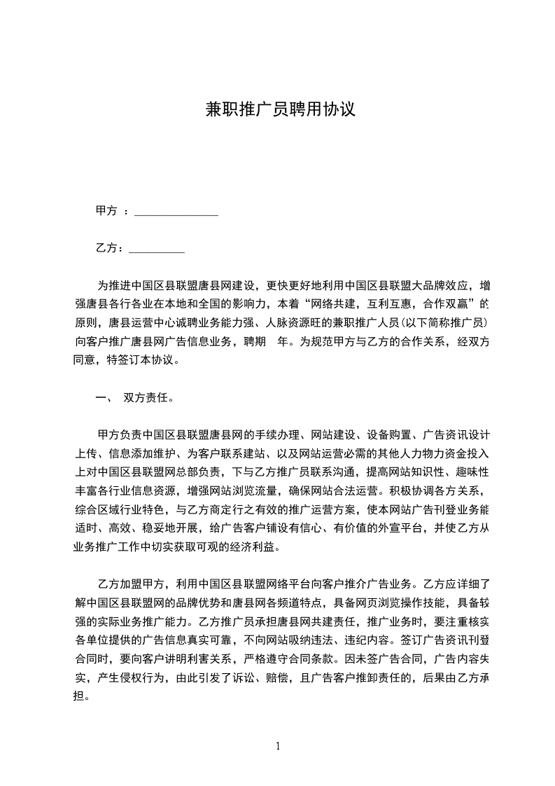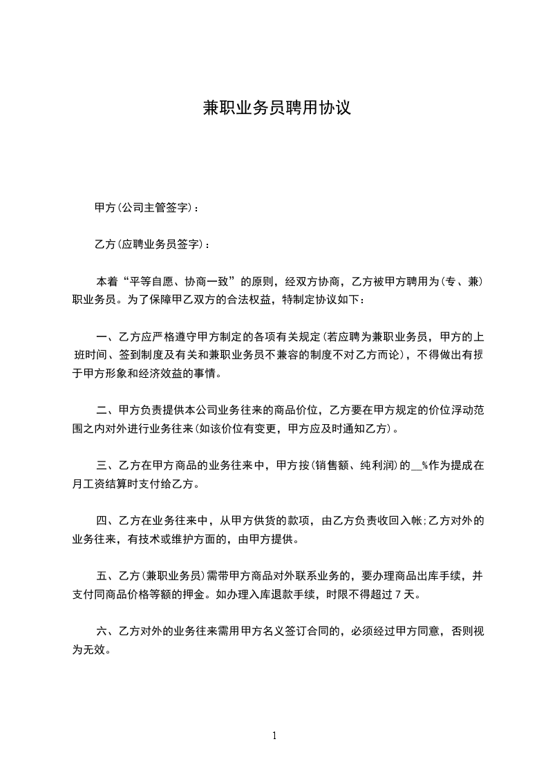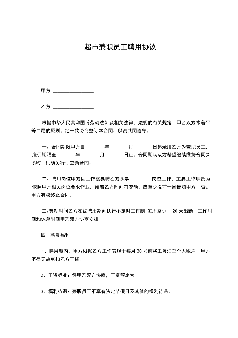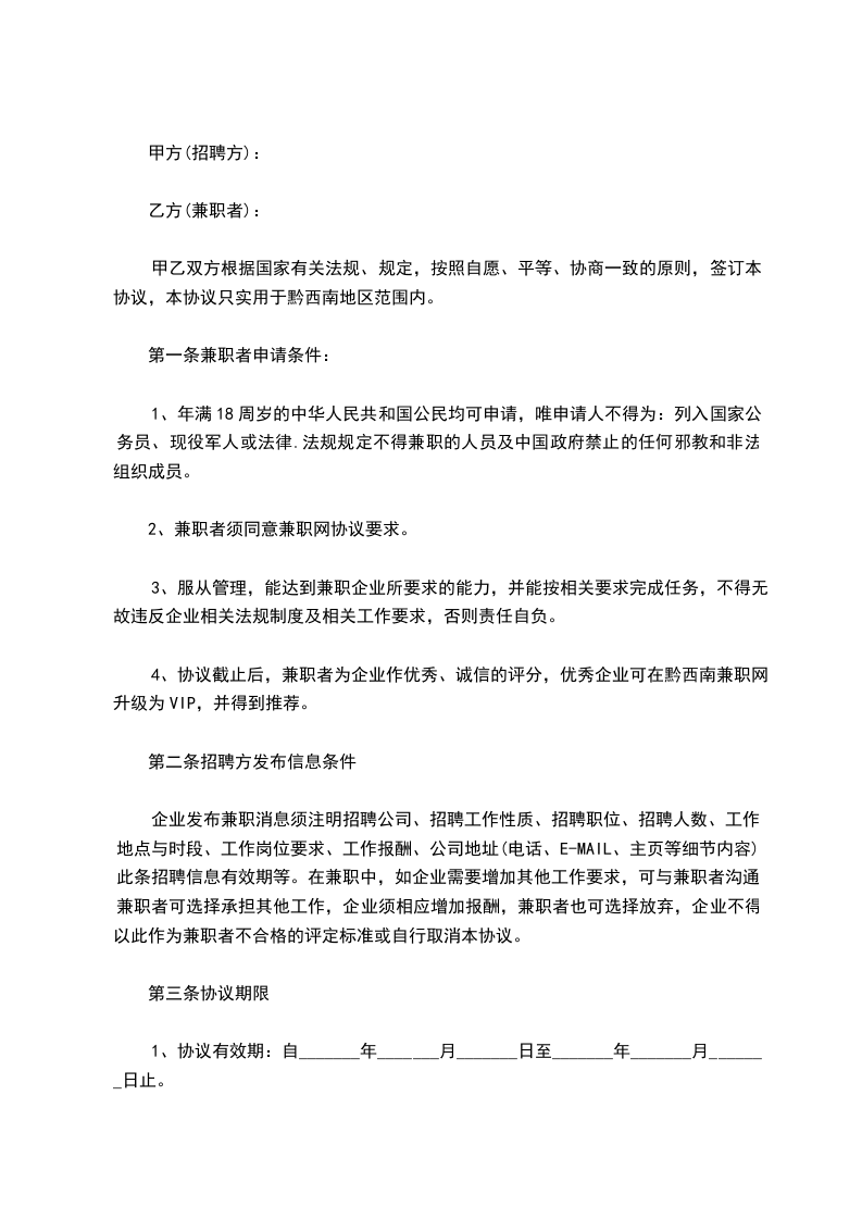 甲方自_____年_____月_____日起录用乙方为兼职员工,雇佣期限至_____年_____月_____日止,合同期满双方希望继续维持合同关系时,则须另行订立新合同。