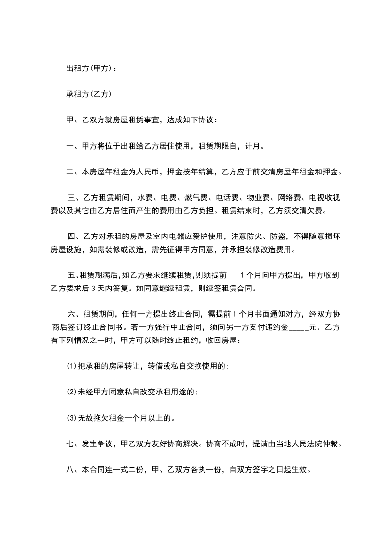 第十条乙方需退房的话,因提前半个月告知甲方。租住不满____月,租金按一个月收取。