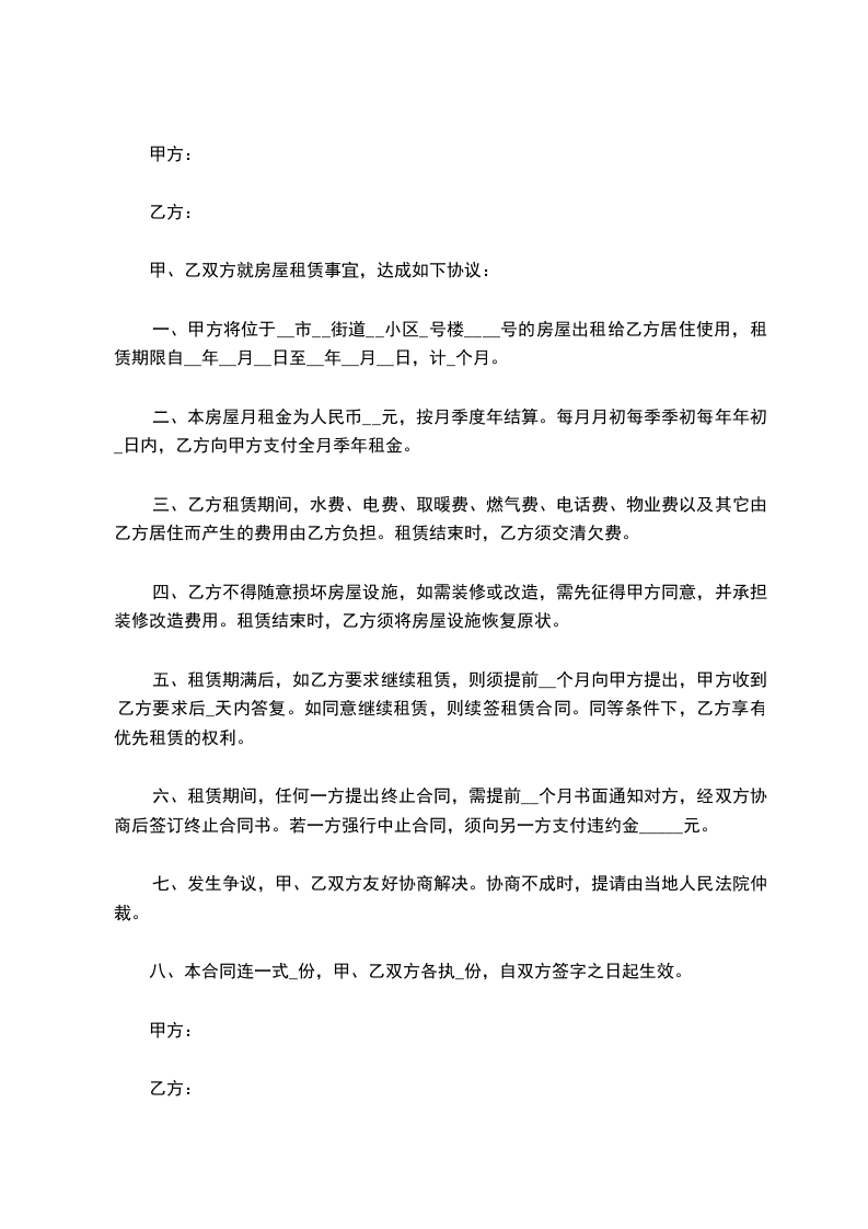 二、每月租金___元,乙方第一次付__个月租金合计_____元,第二次付款应在前次租金期满前一个月支付,租期满不续租提前一个月通知甲方,如逾期不交乙方应主动搬出,否则甲方有权将房屋收回或通过诉讼解决。