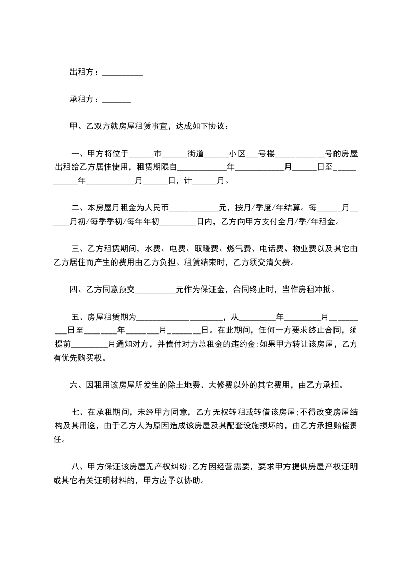 一、甲方将位于______市______街道______小区___号楼____________号的房屋出租给乙方居住使用,租赁期限自____________年____________月______日至____________年____________月______日,计______月。