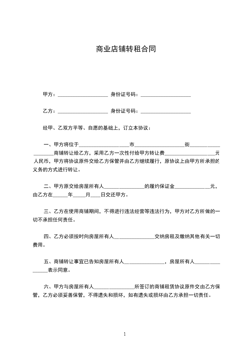 第一条甲方于__年__月__日前将位于____商铺{面积平方米}转让给乙方使用。