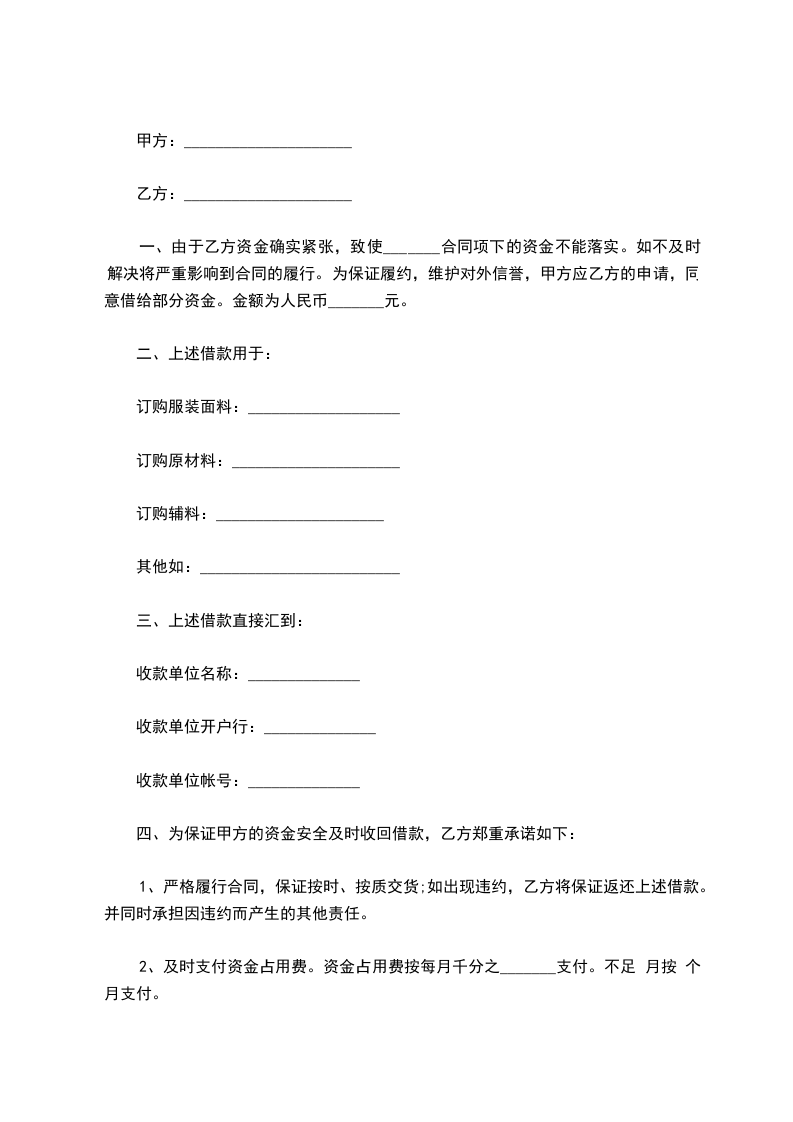一、由于乙方资金确实紧张,致使_______合同项下的资金不能落实。如不及时解决将严重影响到合同的履行。为保证履约,维护对外信誉,甲方应乙方的申请,同意借给部分资金。金额为人民币_______元。