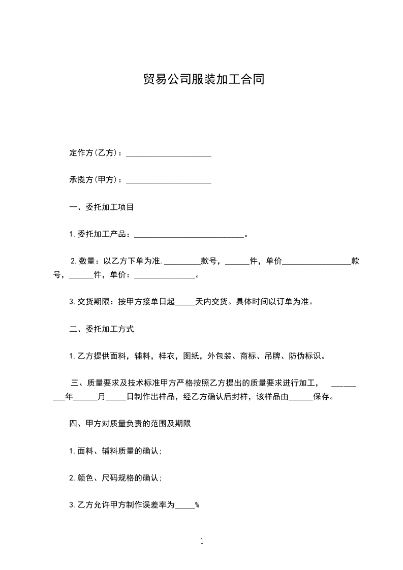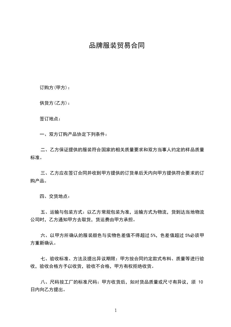 八、尺码按工厂的标准尺码:甲方收货后,如对货品质量或尺寸有异议,须于10日内向乙方提出。