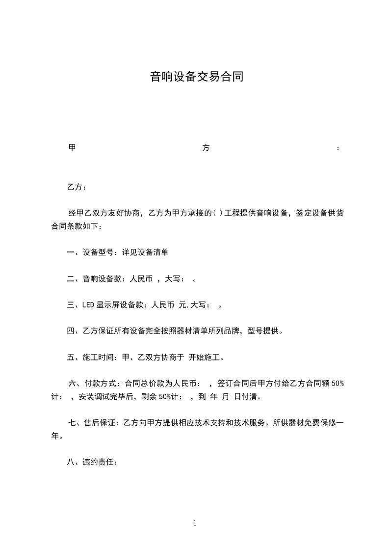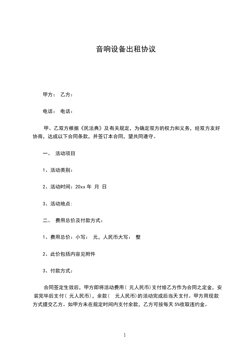 五、租金支付:全款总额_________元人民币。此为不含税价。如甲方负责运输,则按双方约定的时间到乙方公司接人员及设备,并在活动结束后负责运回。在活动当天,服务人员与设备全部运到并安装调试后,甲方需全款结给乙方,作为劳务报酬。如为多天活动,则需另议。