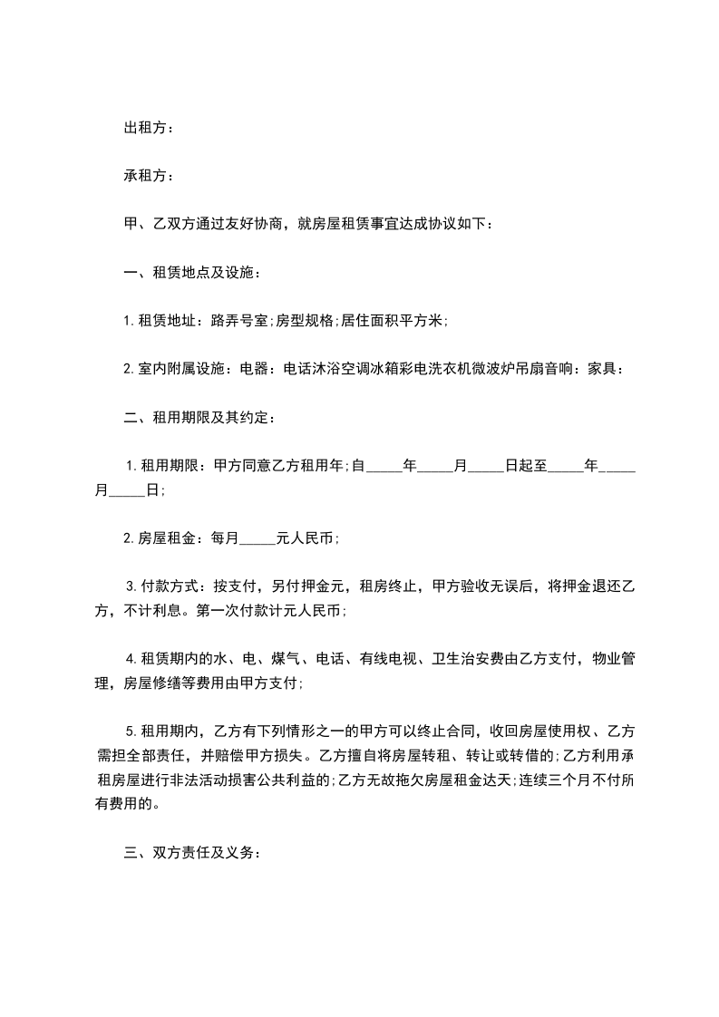 5.租用期内,乙方有下列情形之一的甲方可以终止合同,收回房屋使用权、乙方需担全部责任,并赔偿甲方损失。乙方擅自将房屋转租、转让或转借的;乙方利用承租房屋进行非法活动损害公共利益的;乙方无故拖欠房屋租金达天;连续三个月不付所有费用的。