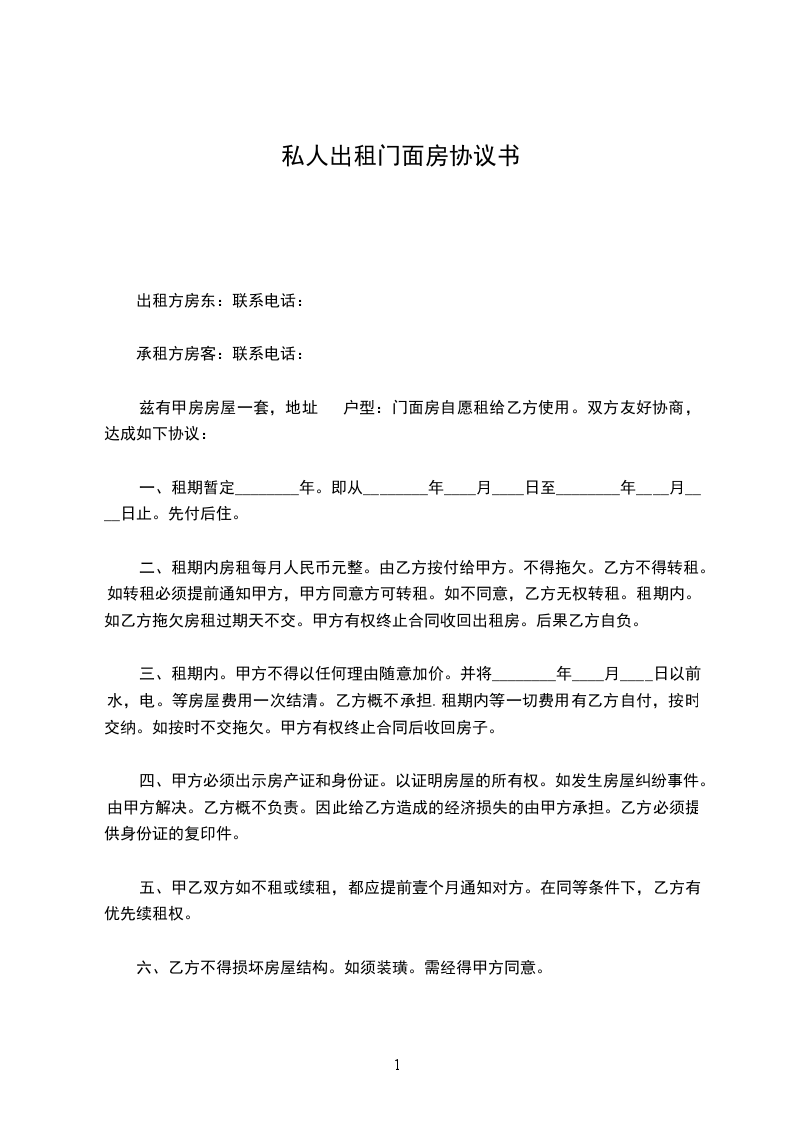 兹有甲房房屋一套,地址 户型:门面房自愿租给乙方使用。双方友好协商,达成如下协议: