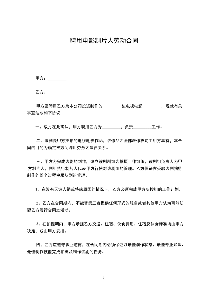 三、甲方为完成该剧的制作,确立该剧剧组为拍摄工作组织,该剧组负责人为甲方制片人,剧组执行制片人代表甲方行使对该剧组的管理。乙方保证在受聘该剧拍摄制作的整个过程中服从剧组管理。