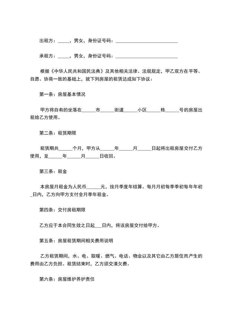 承租方_____,男/女,身份证号码___________________________
