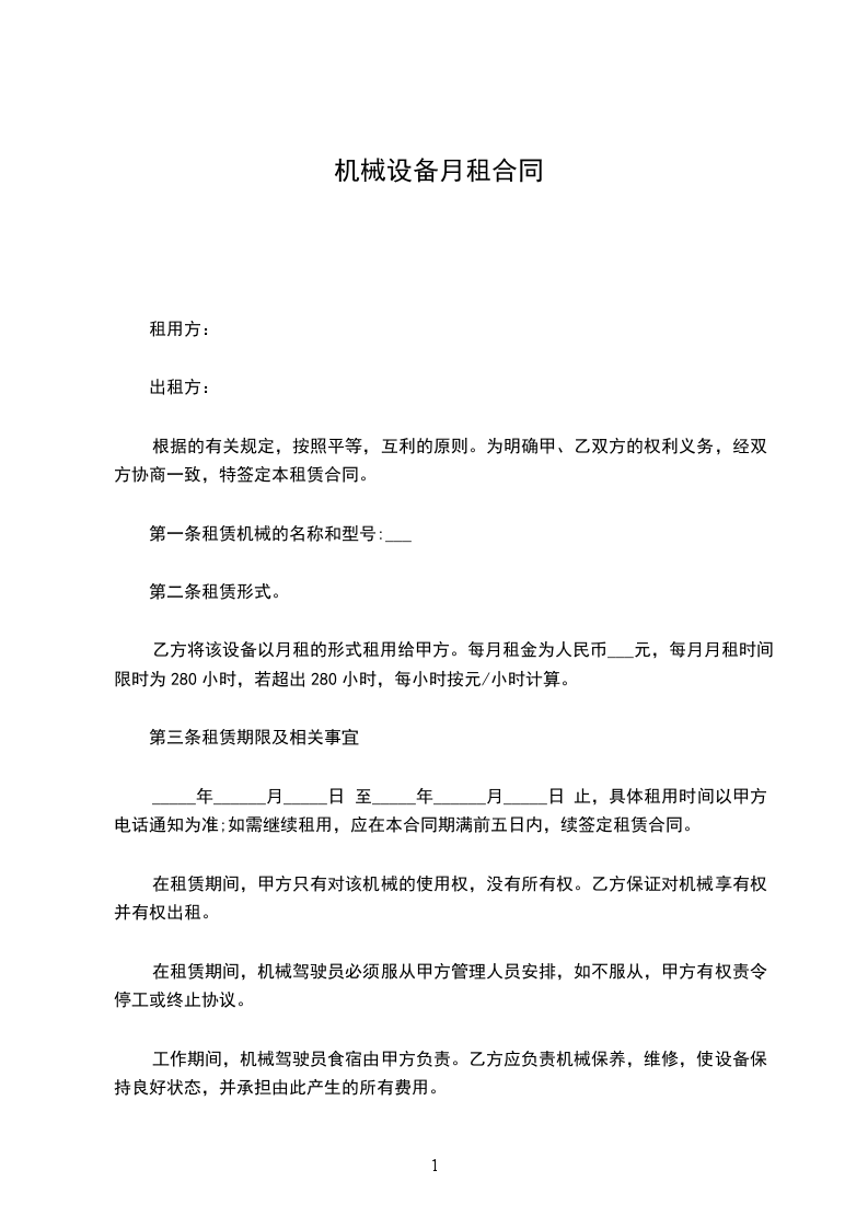 乙方将该设备以月租的形式租用给甲方。每月租金为人民币___元,每月月租时间限时为280小时,若超出280小时,每小时按_____元/小时计算。