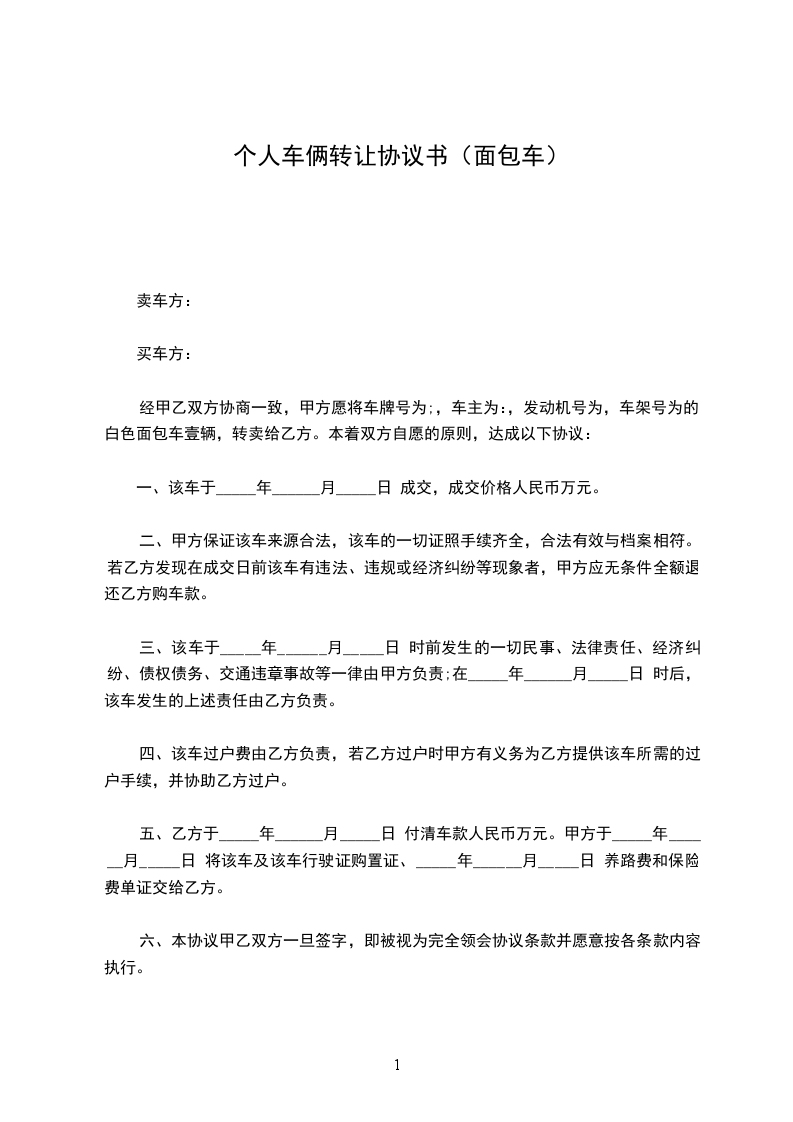 经甲乙双方协商一致,甲方愿将车牌号为;,车主为:,发动机号为,车架号为的白色面包车壹辆,转卖给乙方。本着双方自愿的原则,达成以下协议: