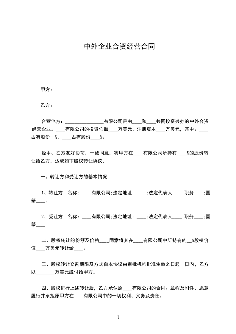 合营他方:________________有限公司是由____和____共同投资兴办的中外合资经营企业。____有限公司的投资总额____万美元,注册资本____万美元,其中:____占有股份--%,____占有股份____%。
