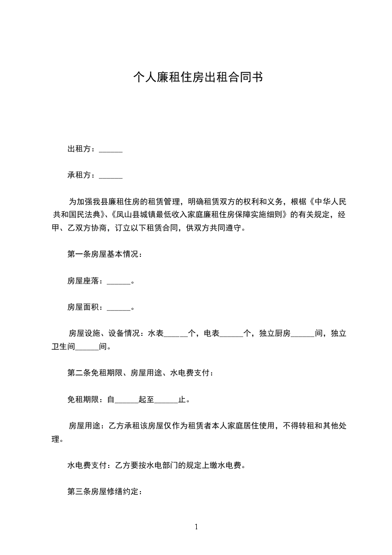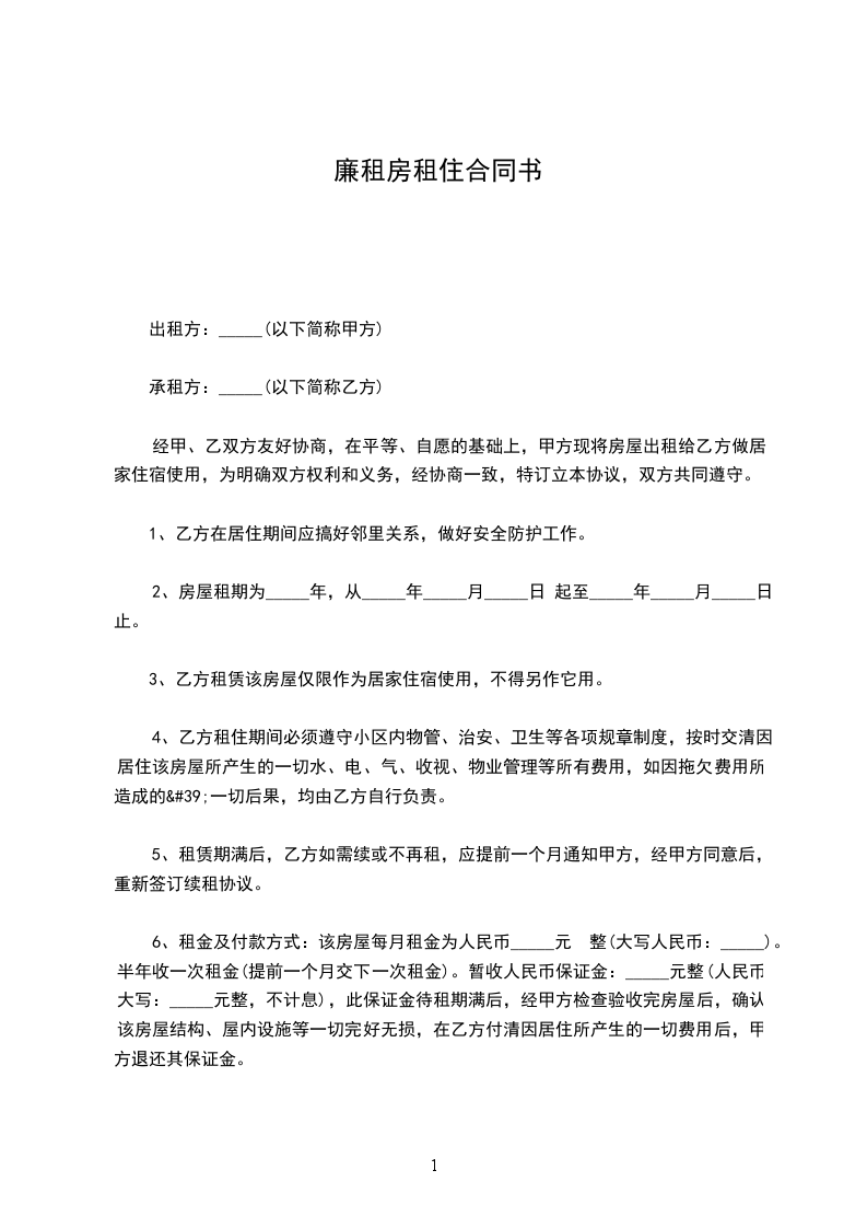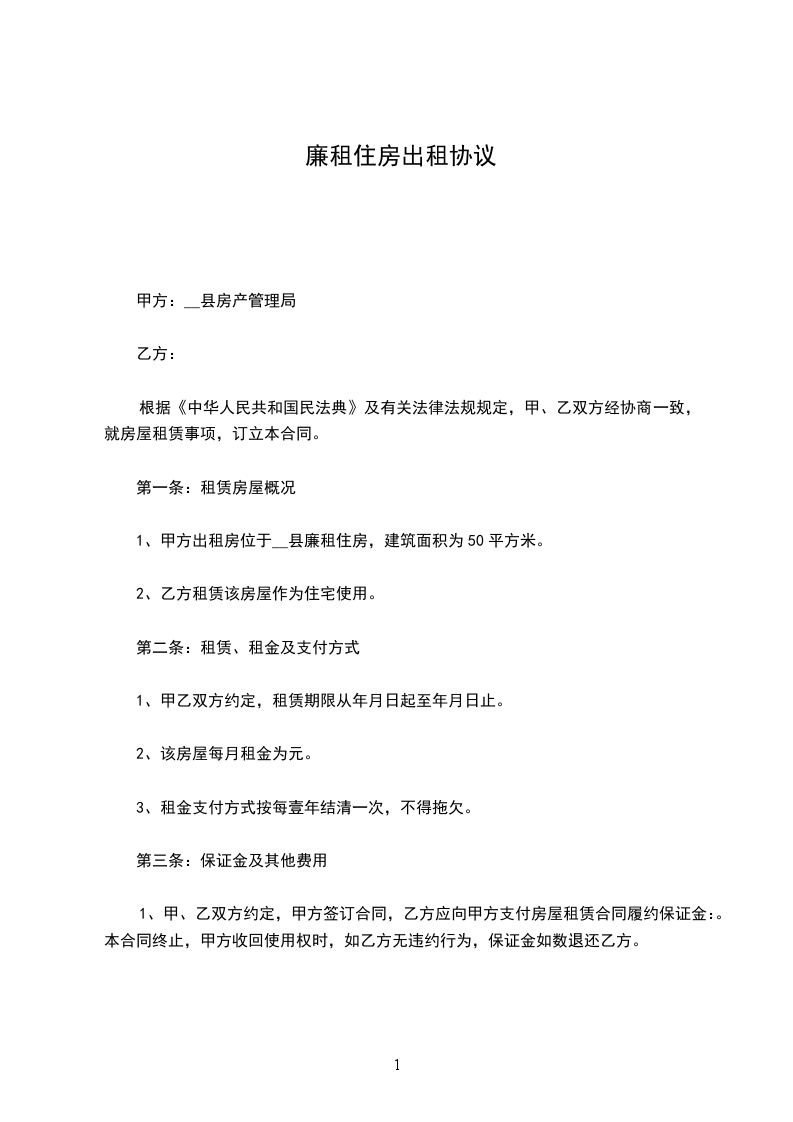1、甲方出租房位于__县廉租住房,建筑面积为50平方米。