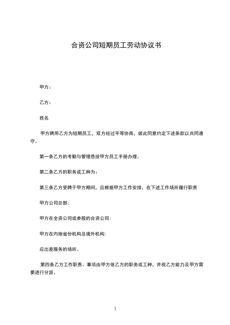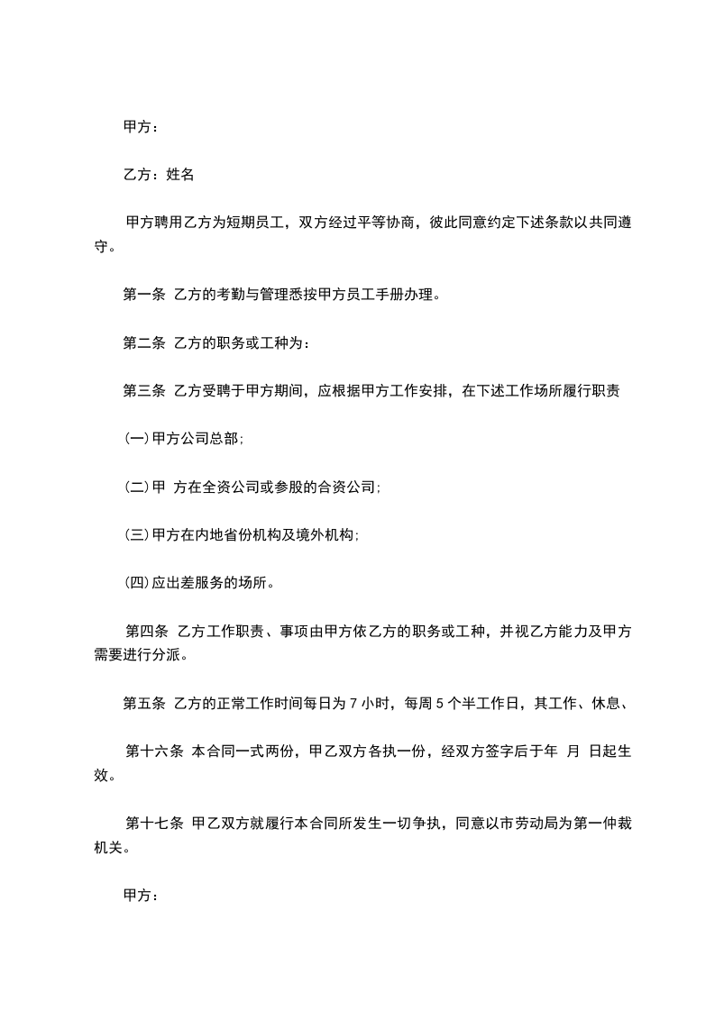 甲方聘用乙方为短期员工,双方经过平等协商,彼此同意约定下述条款以共同遵守。