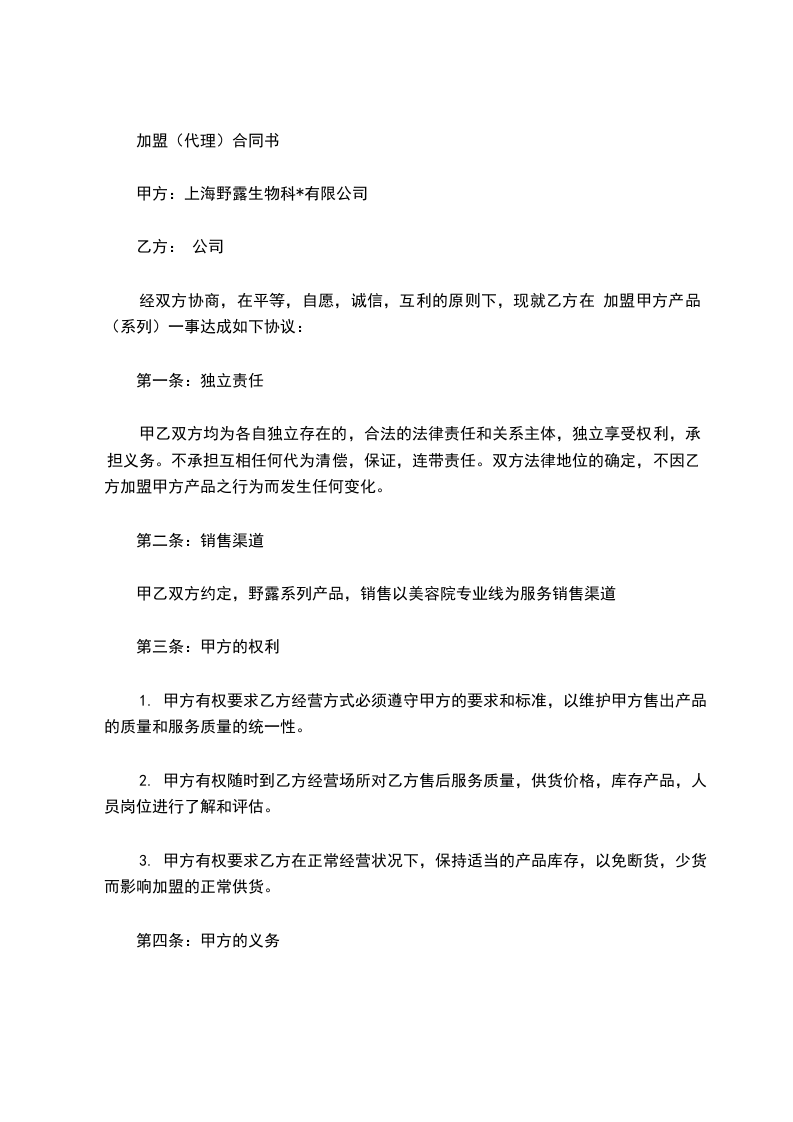 经双方协商,在平等,自愿,诚信,互利的原则下,现就乙方在 加盟甲方产品(系列)一事达成如下协议: