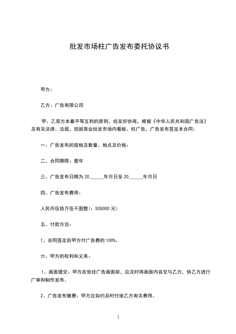 甲、乙双方本着平等互利的原则,经友好协商,根据《中华人民共和国广告法》及有关法律、法规,现就商业批发市场内看板、柱广告,广告发布签定本合同: