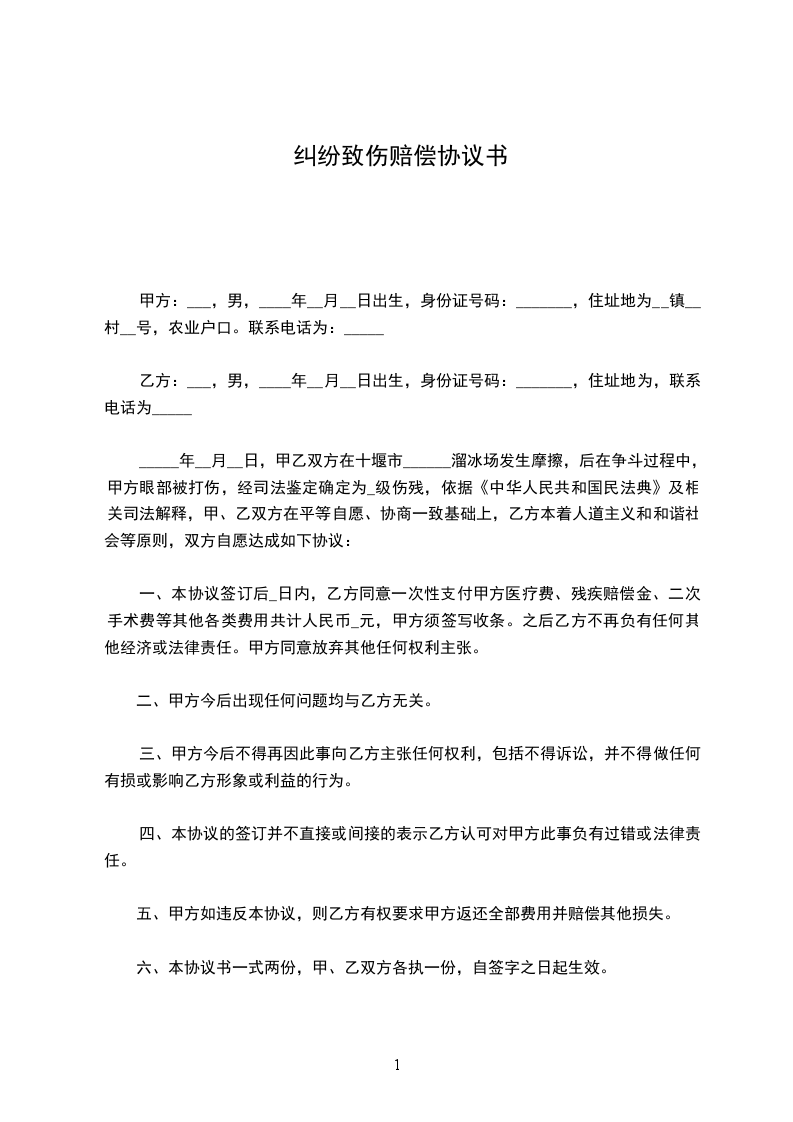 _____年__月__日,甲乙双方在十堰市______溜冰场发生摩擦,后在争斗过程中,甲方眼部被打伤,经司法鉴定确定为_级伤残,依据《中华人民共和国民法典》及相关司法解释,甲、乙双方在平等自愿、协商一致基础上,乙方本着人道主义和和谐社会等原则,双方自愿达成如下协议:
