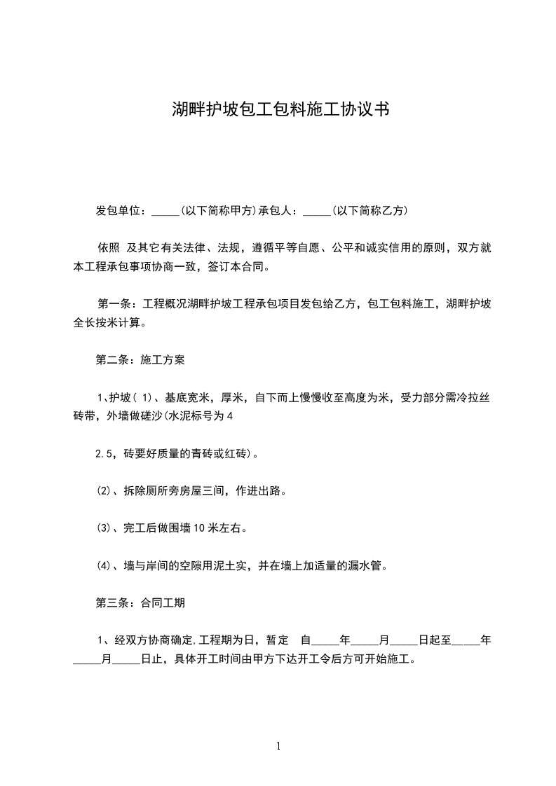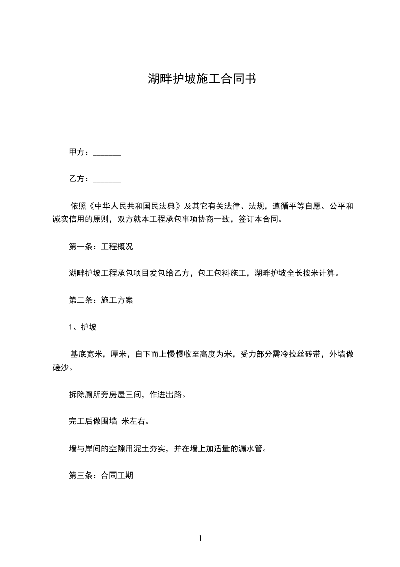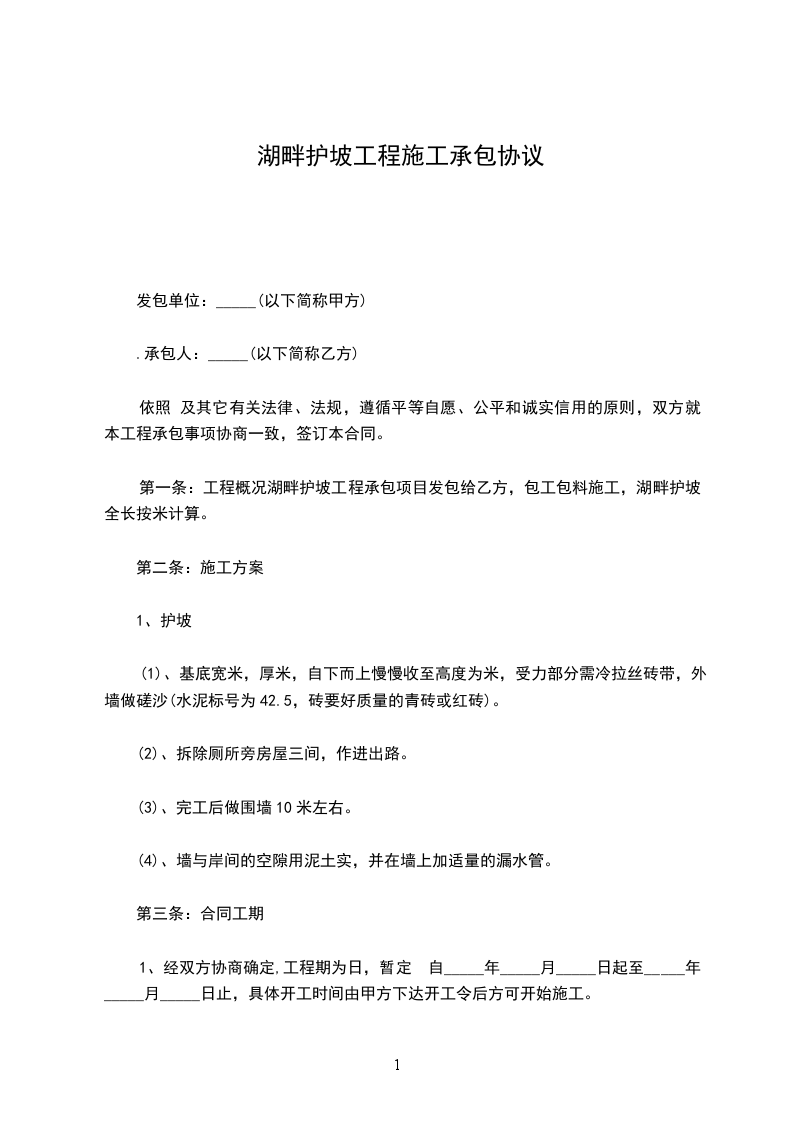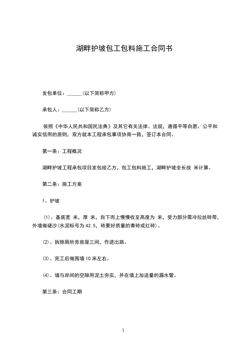 湖畔护坡工程承包项目发包给乙方,包工包料施工,湖畔护坡全长按米计算。