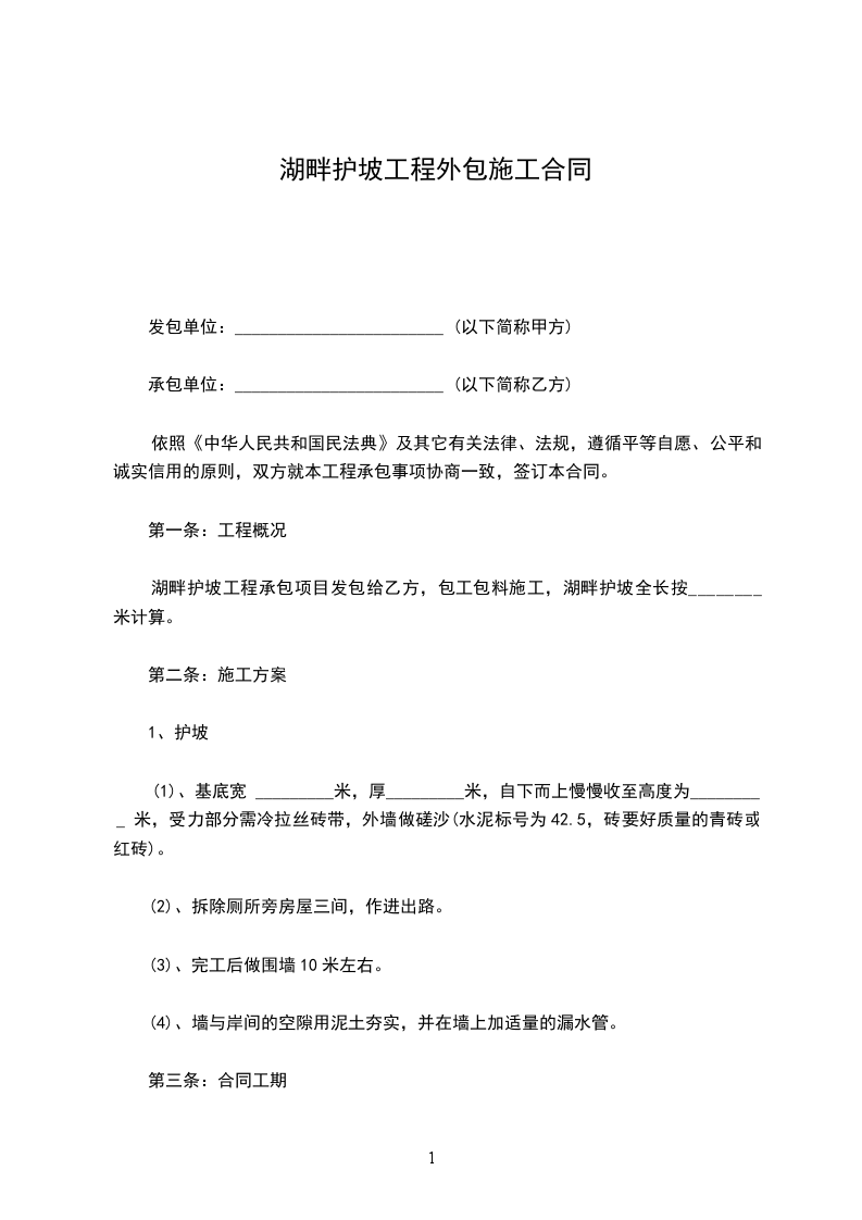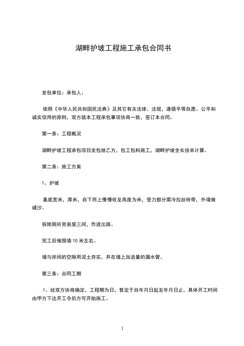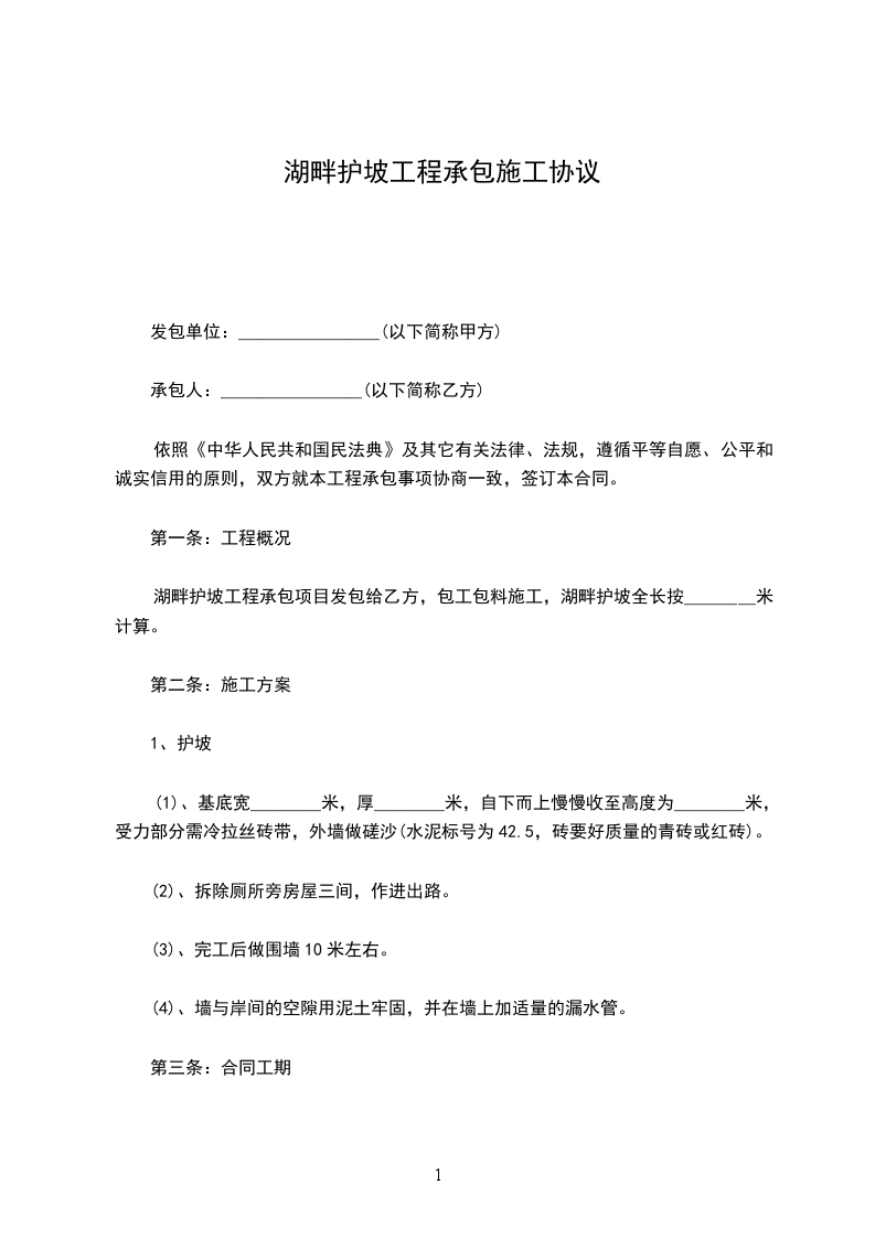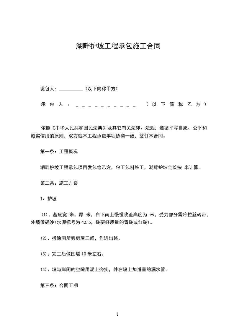 湖畔护坡工程承包项目发包给乙方,包工包料施工,湖畔护坡全长按米计算。