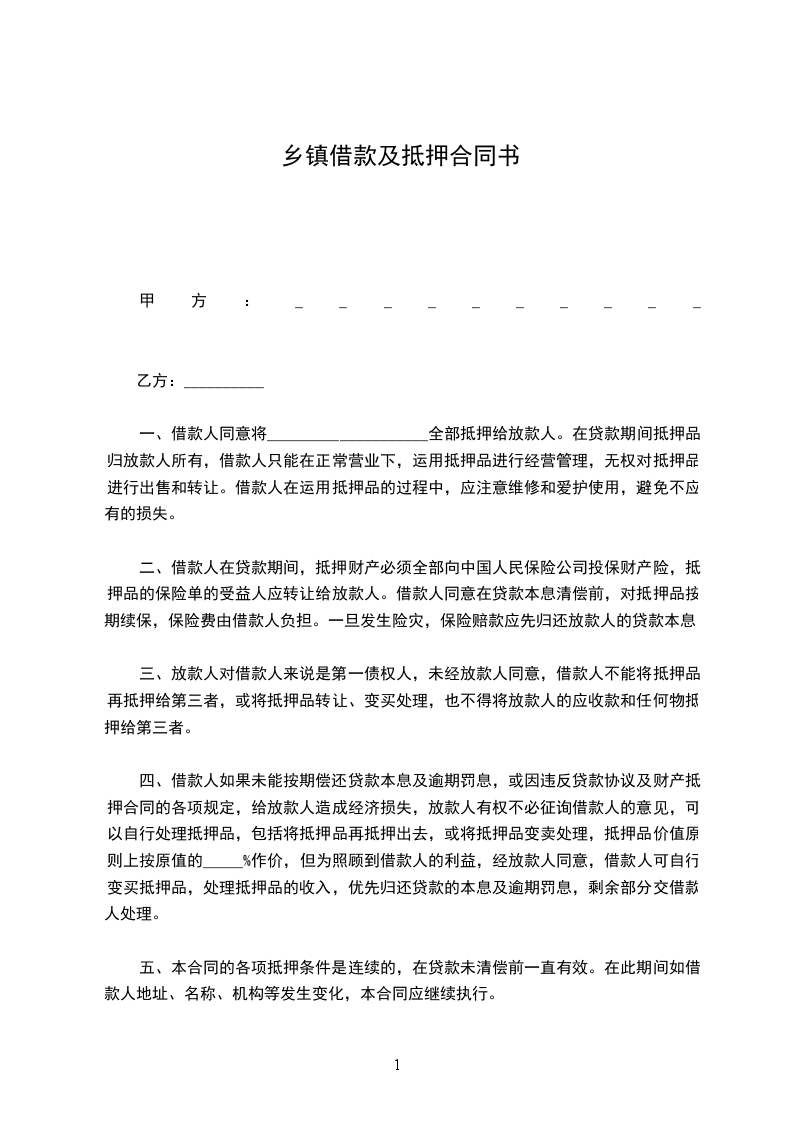 一、借款人同意将____________________全部抵押给放款人。在贷款期间抵押品归放款人所有,借款人只能在正常营业下,运用抵押品进行经营管理,无权对抵押品进行出售和转让。借款人在运用抵押品的过程中,应注意维修和爱护使用,避免不应有的损失。