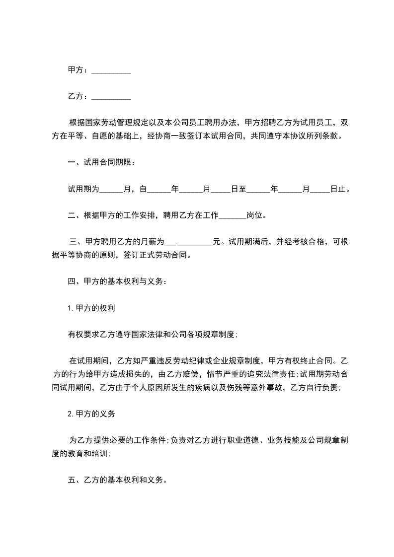 根据国家劳动管理规定以及本公司员工聘用办法,甲方招聘乙方为试用员工,双方在平等、自愿的基础上,经协商一致签订本试用合同,共同遵守本协议所列条款。