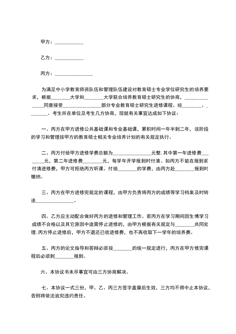 为满足中小学教育师资队伍和管理队伍建设对教育硕士专业学位研究生的培养要求,根据________大学和________大学联合培养教育硕士研究生的协商,_______________同意接受________________部分专业教育硕士研究生进修课程。经________、________、考生所在单位及考生几方协商,现就有关事宜达成如下协议: