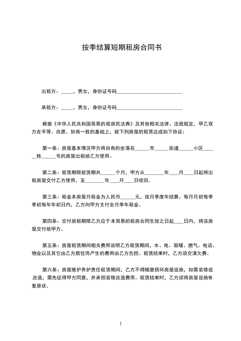 承租方:_____,男女,身份证号码___________________________
