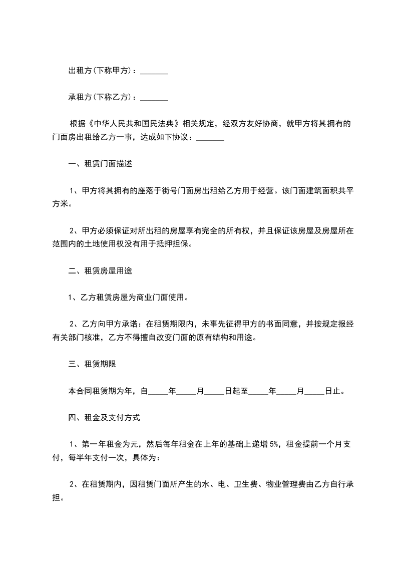 一、承包租赁期限:从________年____月____日至________年____月____日共计________年,________年以内租金不调整,________年期满租金根据市场变化而定,同等条件优先乙方。