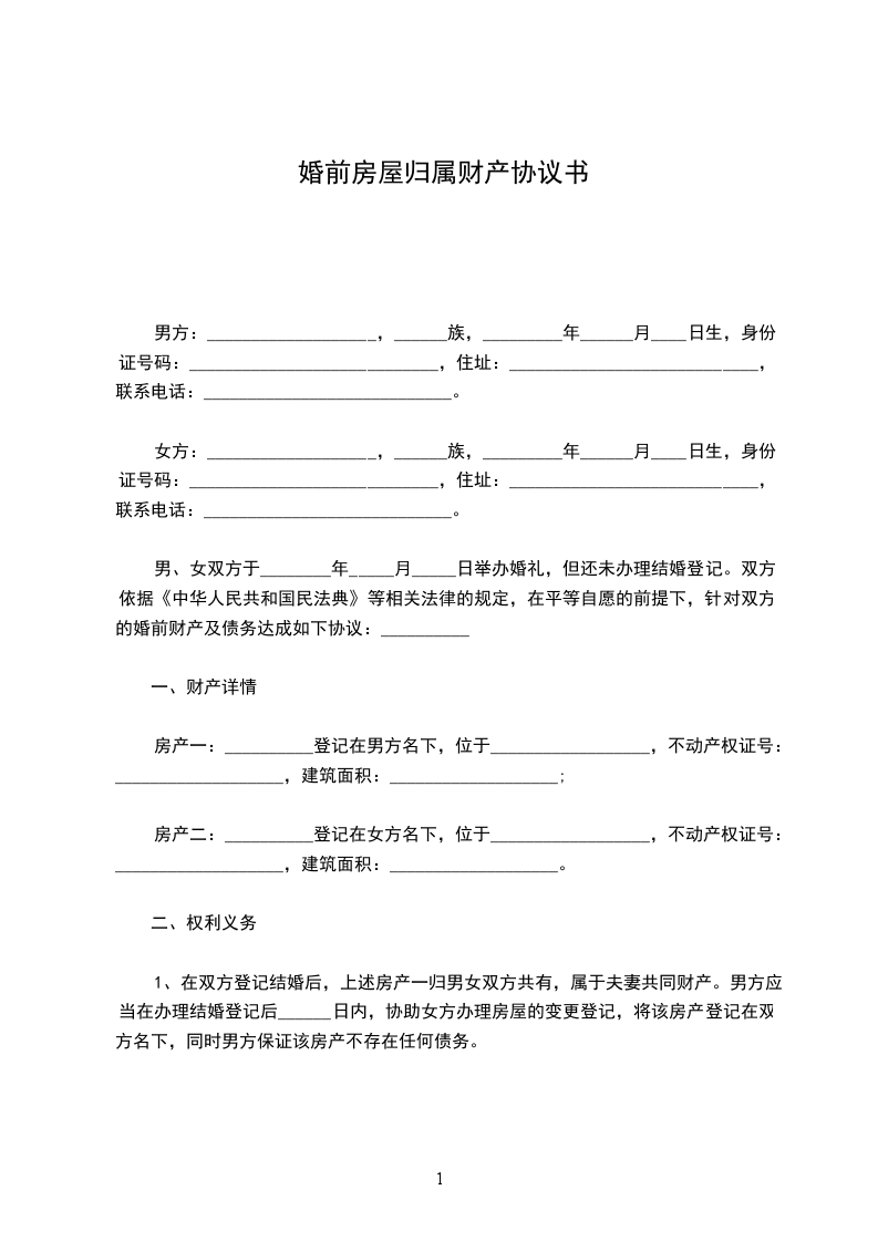 男、女双方于________年_____月_____日举办婚礼,但还未办理结婚登记。双方依据《中华人民共和国民法典》等相关法律的规定,在平等自愿的前提下,针对双方的婚前财产及债务达成如下协议:__________