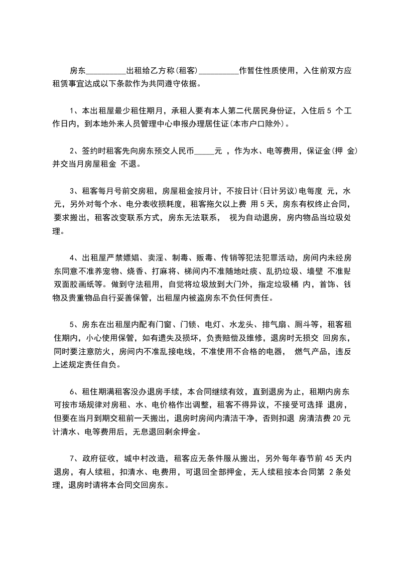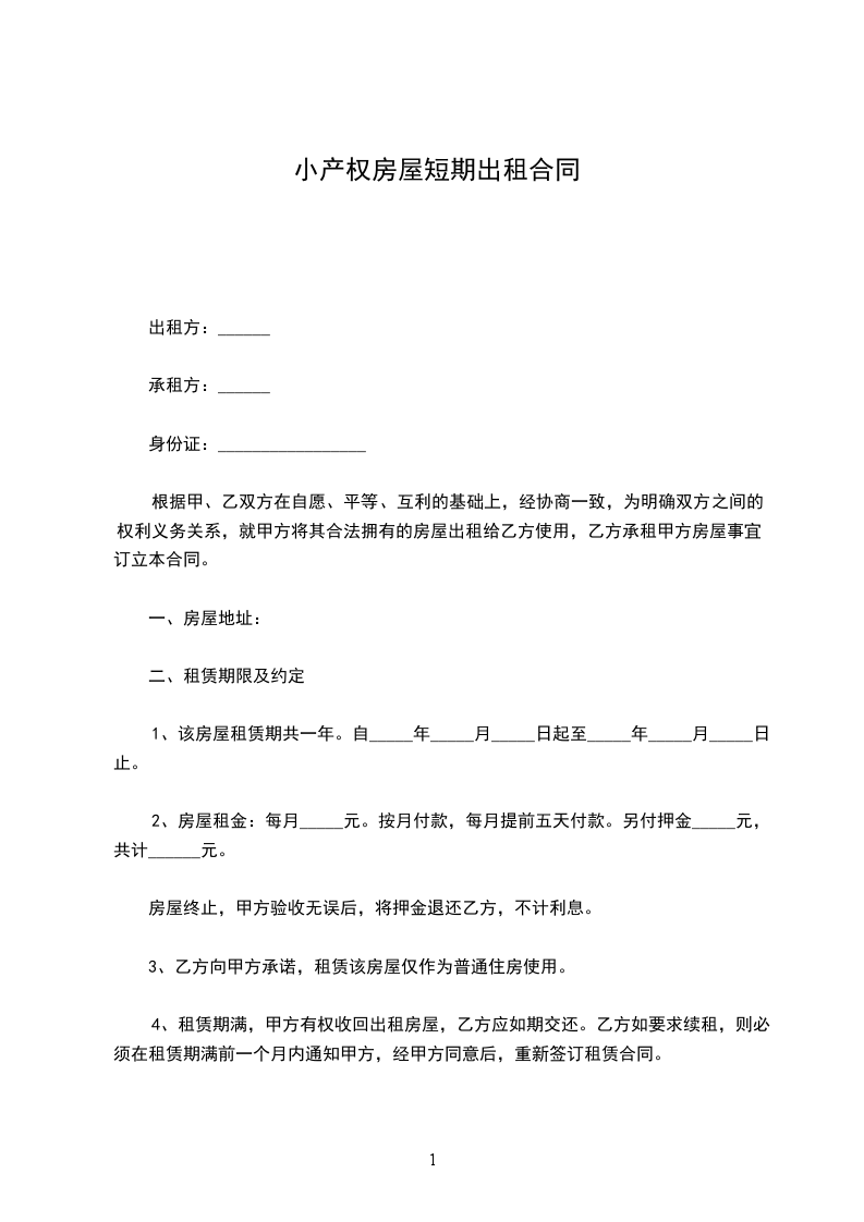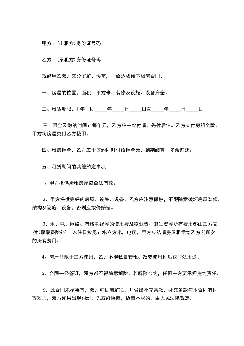 1、该房屋租赁期共一年。自_____年_____月_____日起至_____年_____月_____日止。