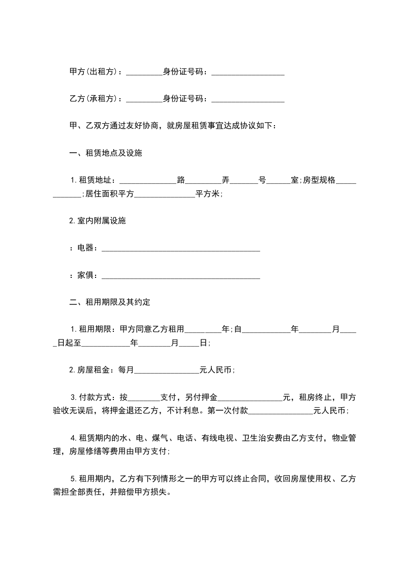 4、租赁期满,甲方有权收回出租房屋,乙方应如期交还。乙方如要求续租,则必须在租赁期满前一个月内通知甲方,经甲方同意后,重新签订租赁合同。