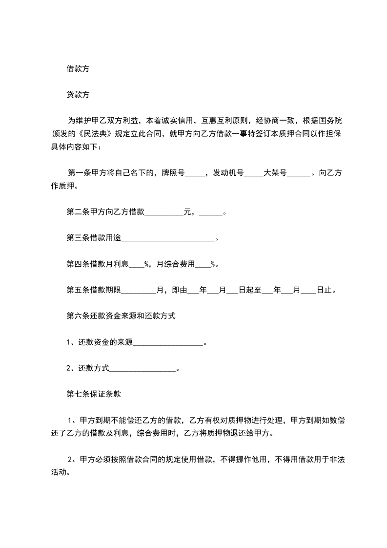 第一条甲方将自己名下的,牌照号_____,发动机号_____大架号______。向乙方作质押。