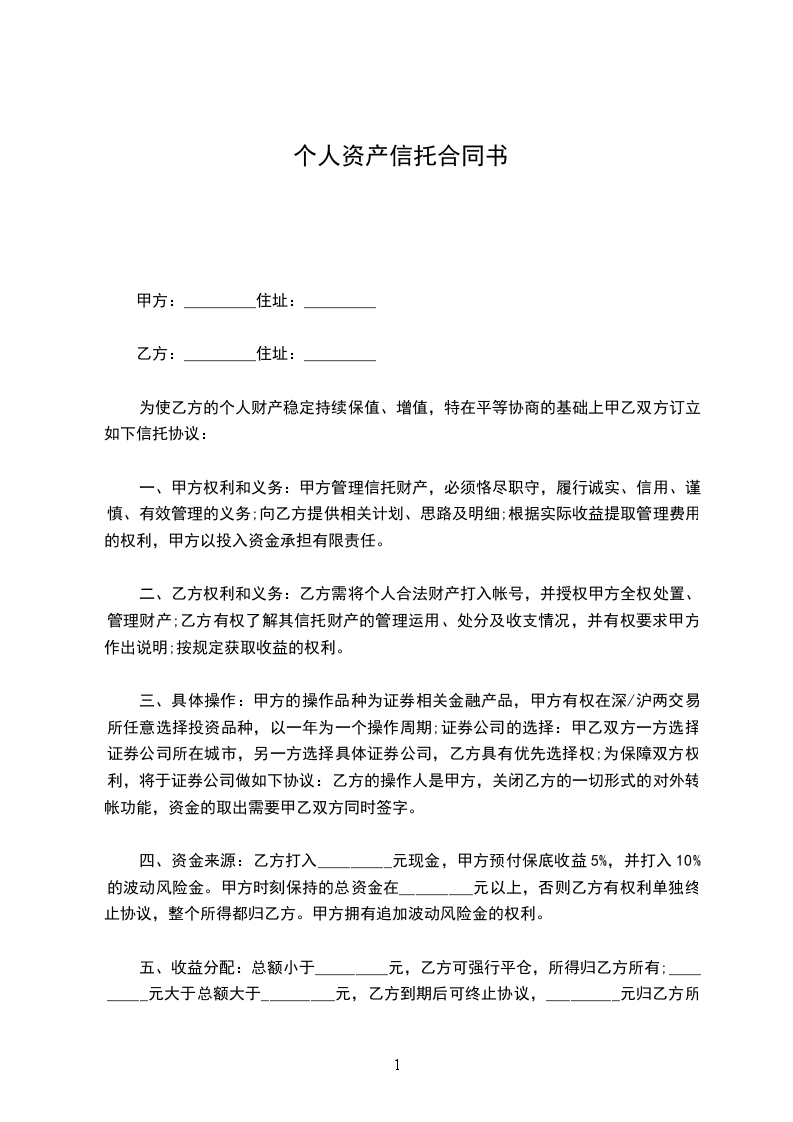 为使乙方的个人财产稳定持续保值、增值,特在平等协商的基础上甲乙双方订立如下信托协议: