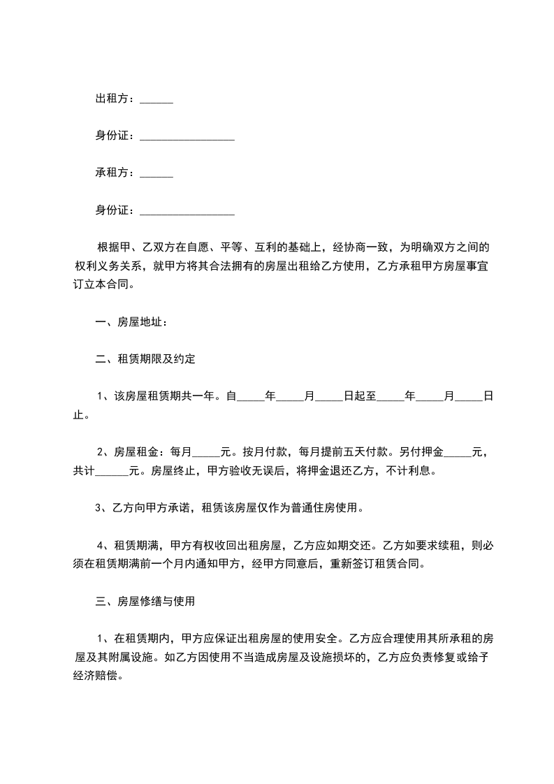 1、该房屋租赁期共一年。自_____年_____月_____日起至_____年_____月_____日止。