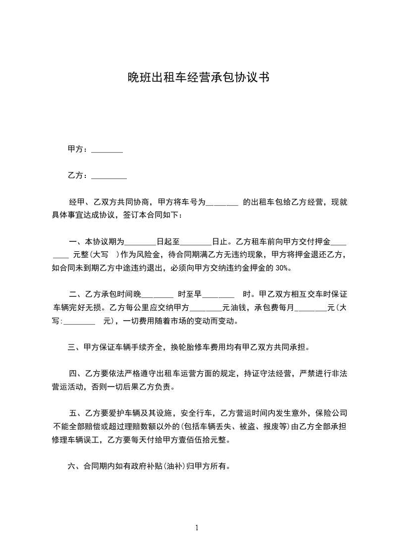 甲方将南宁公司出租车分公司承包给甲方一辆上海大众出租车,车号为:承租给乙方晚上营运,承租日期:从_____年_____月_____日至_____年_____月_____日;乙方每日营运时间为当日19:00点至次日7:30点。为保障双方权利和履行义务,本着平等协商的原则,现就有关事宜达成如下协议: