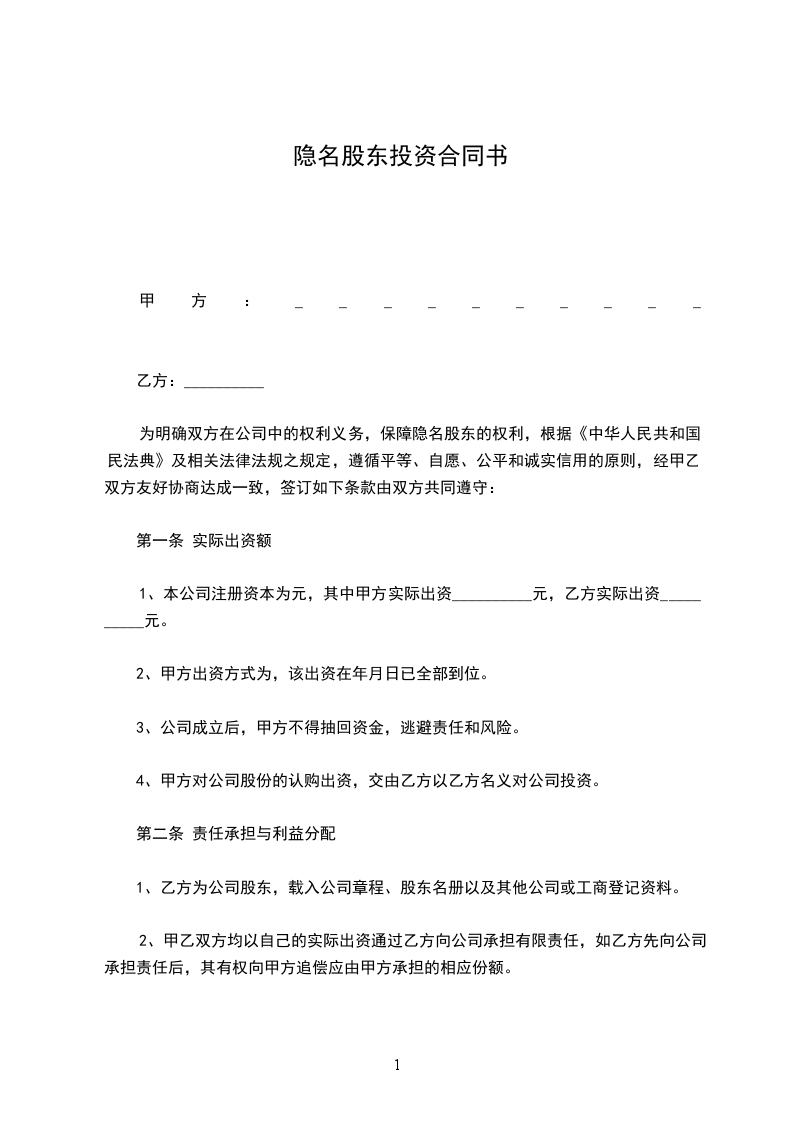 为明确双方在公司中的权利义务,保障隐名股东的权利,根据《中华人民共和国民法典》及相关法律法规之规定,遵循平等、自愿、公平和诚实信用的原则,经甲乙双方友好协商达成一致,签订如下条款由双方共同遵守: