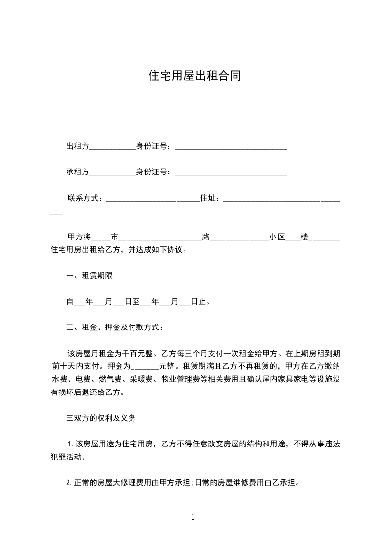1.该房屋用途为住宅用房,乙方不得任意改变房屋的结构和用途,不得从事违法犯罪活动。