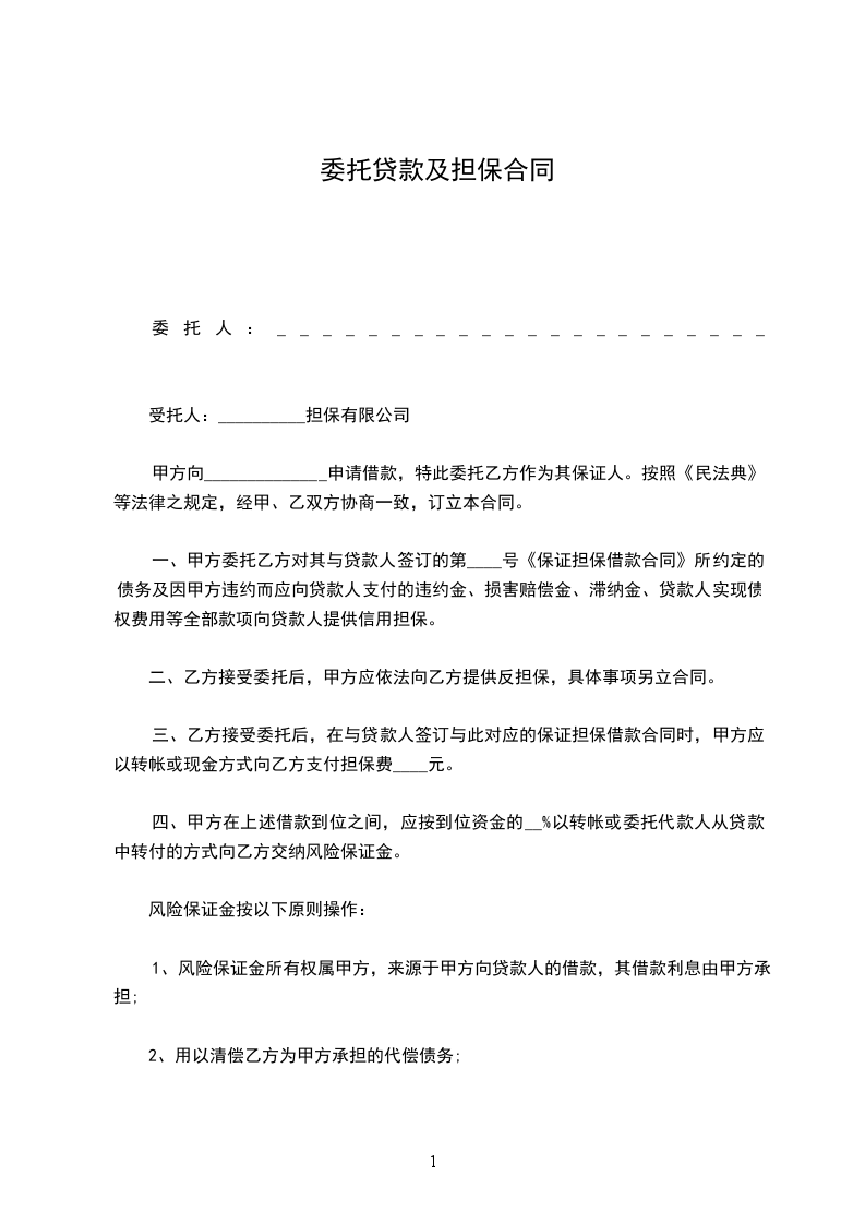 一、甲方委托乙方对其与贷款人签订的第____号《保证担保借款合同》所约定的债务及因甲方违约而应向贷款人支付的违约金、损害赔偿金、滞纳金、贷款人实现债权费用等全部款项向贷款人提供信用担保。