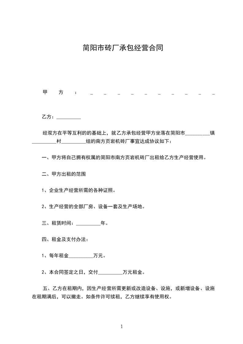 经双方在平等互利的的基础上,就乙方承包经营甲方坐落在简阳市__________镇__________村__________组的南方页岩机砖厂事宜达成协议如下: