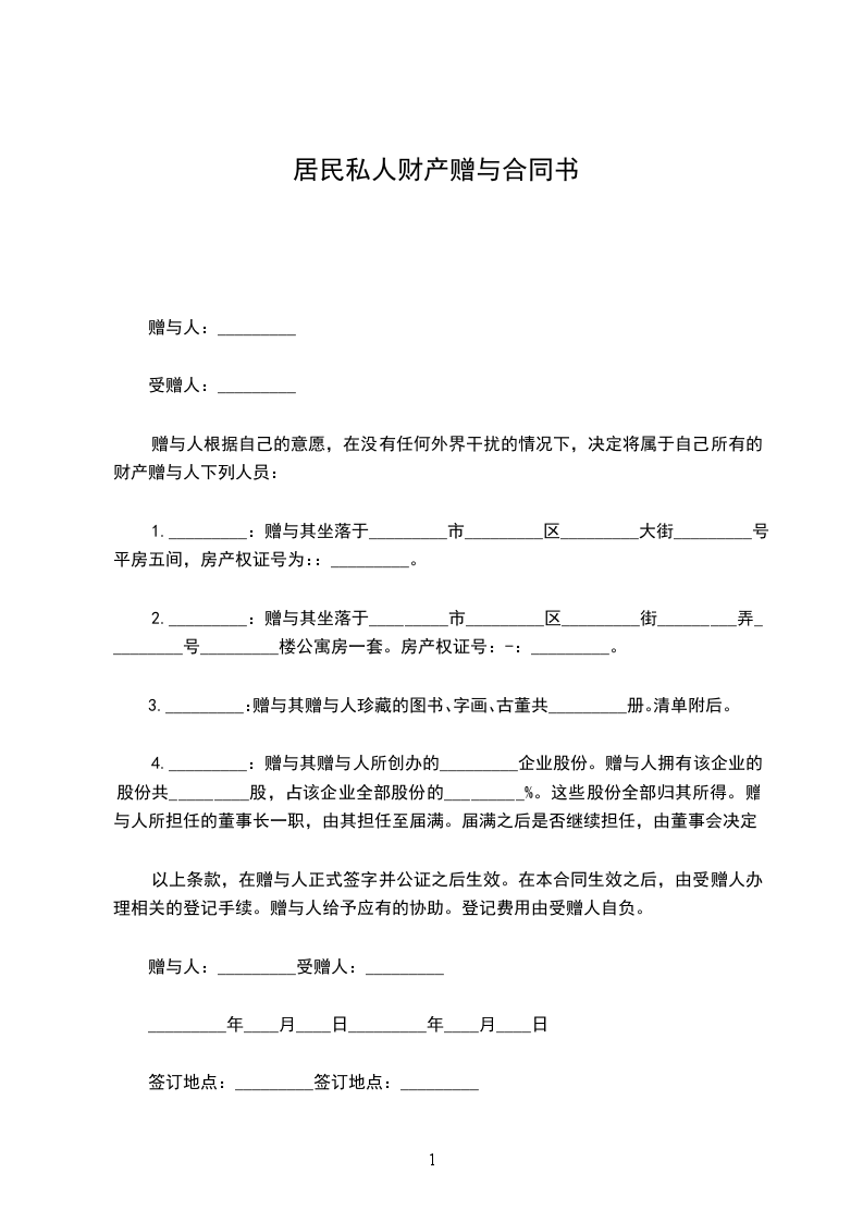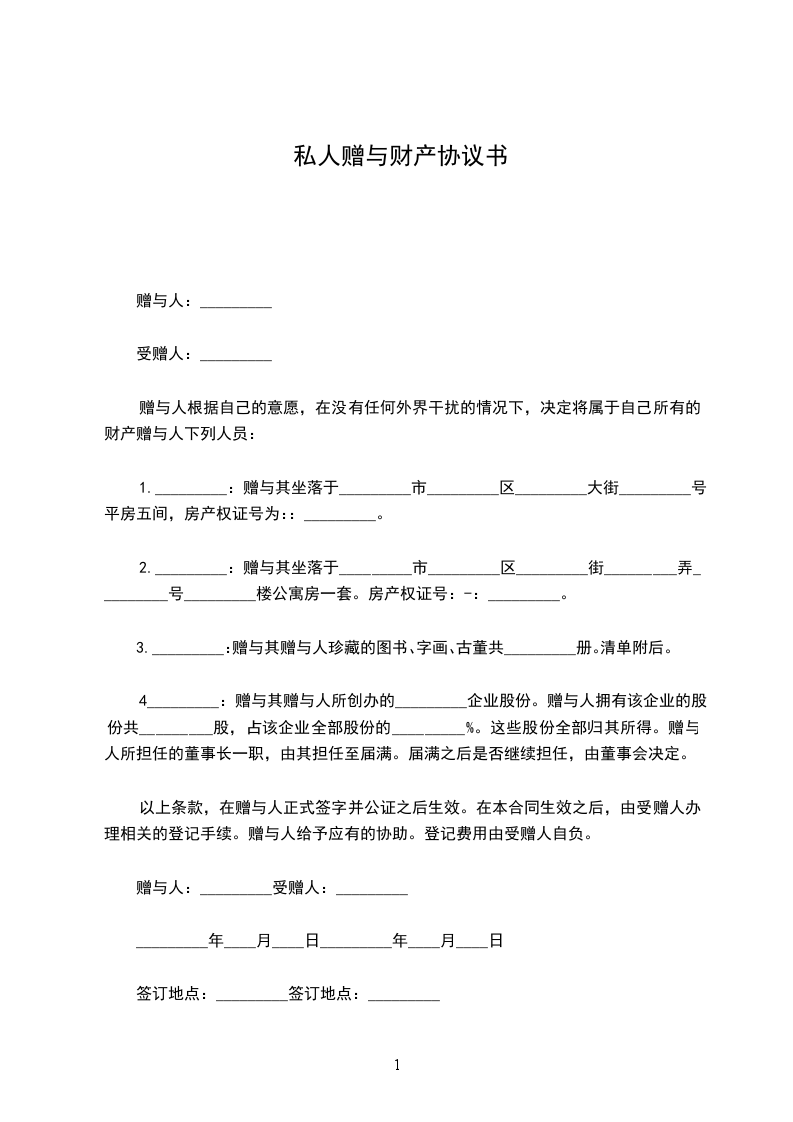 1._________:赠与其坐落于_________市_________区_________大街_________号平房五间,房产权证号为::_________。