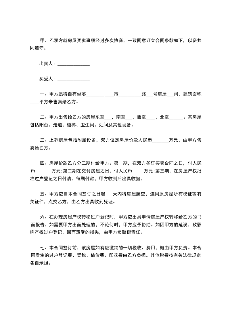 四、房屋价款乙方分三期付给甲方。第一期,在双方签订买卖合同之日,付人民币_______万元;第二期在交付房屋之日,付人民币_____万元;第三期,在房屋产权批准过户登记之日付清。每期付款,甲方收到后出具收据。