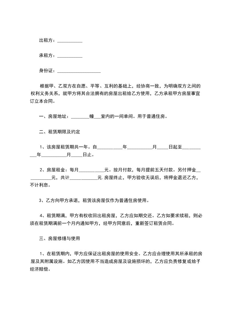 1、该房屋租赁期共一年。自___________年___________月_____日起至___________年___________月_____日止。