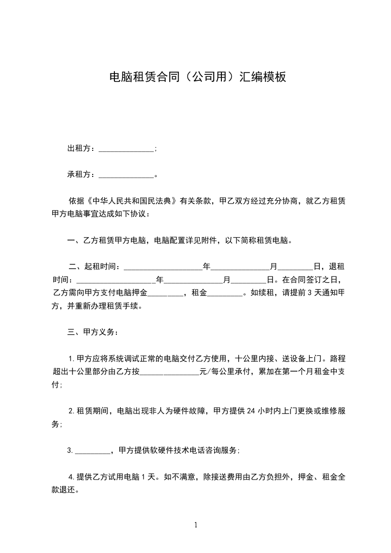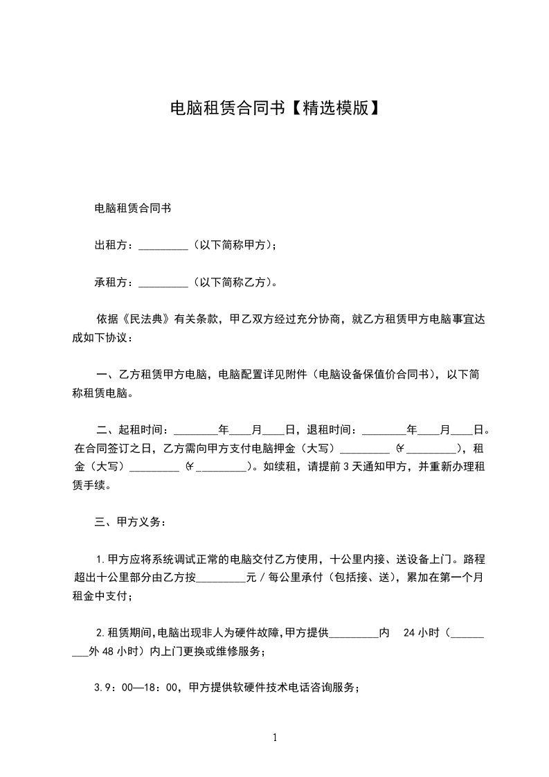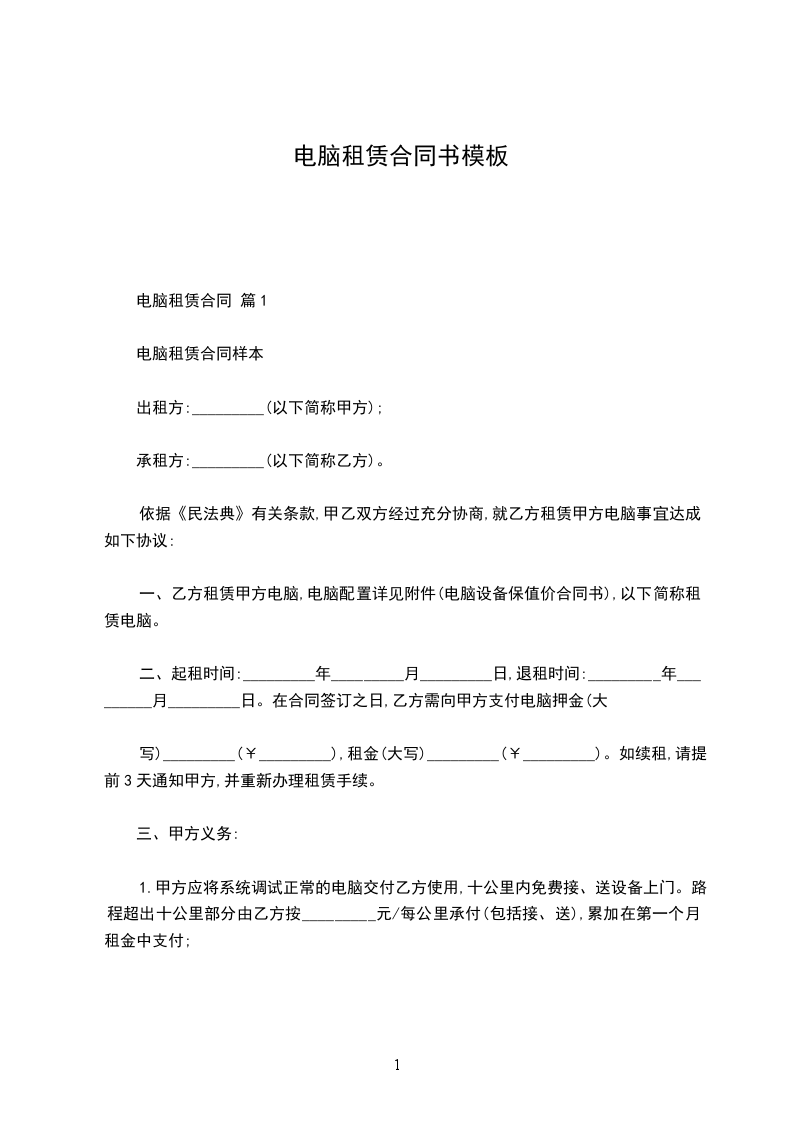 依据《民法典》有关条款,甲乙双方经过充分协商,就乙方租赁甲方电脑事宜达成如下协议: